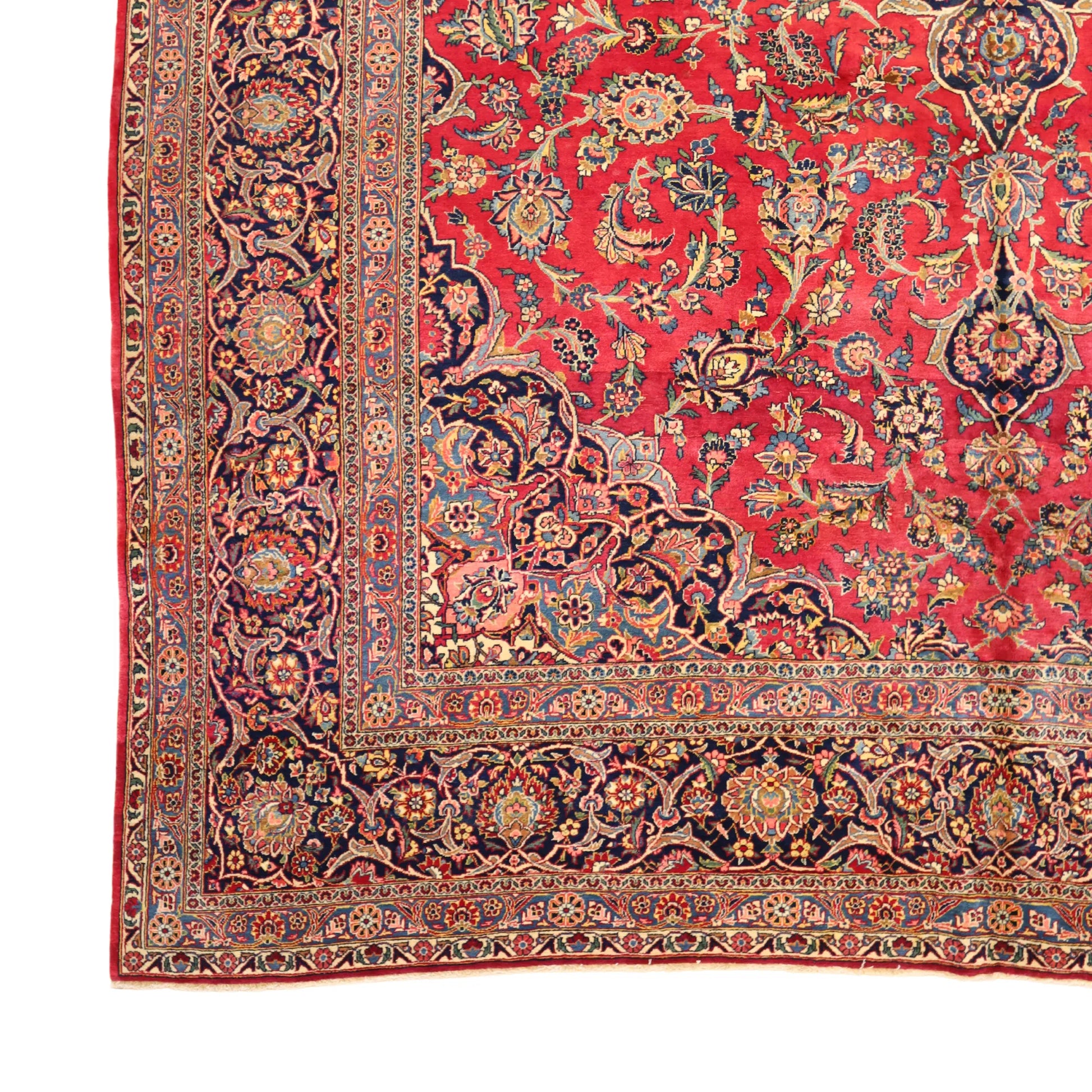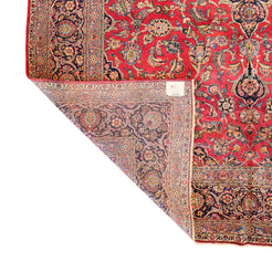 Add Timeless Elegance to Your Space with an Antique Rug. This exquisite KASHAN antique rug, showcasing a rich heritage and intricate artistry, is a testament to timeless beauty. The striking RED background, paired with its intricate NAVY border, creates a captivating contrast that adds sophistication to any room. Perfect for your living room, dining area, or study, this rug blends style with history to enrich your decor. Handcrafted in PERSIA, this rug reflects the skilled craftsmanship and cultural legacy of its origin. With dimensions of 10'3" x 14'0" , its high-quality construction ensures lasting beauty for generations to come.