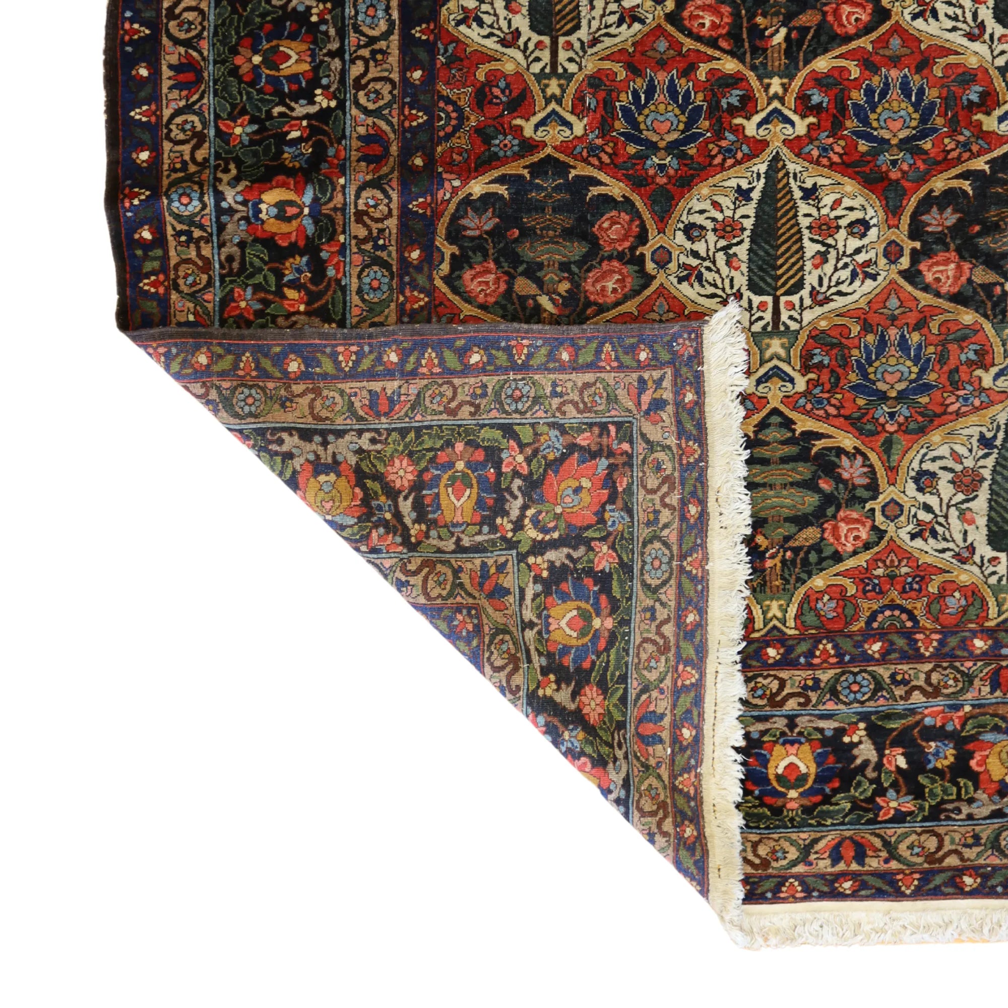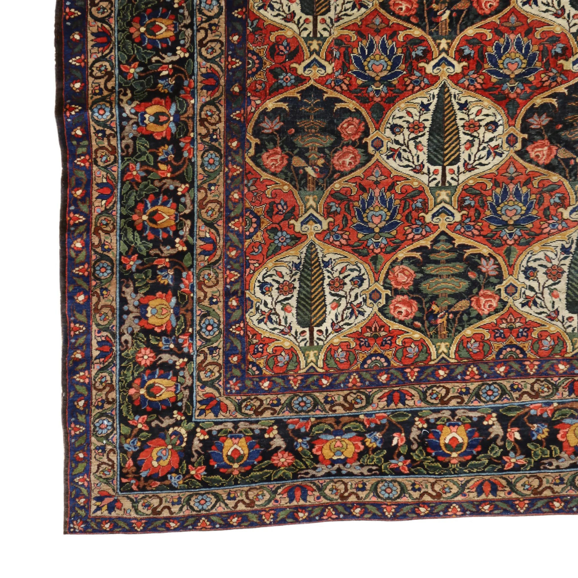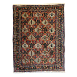 Add Timeless Elegance to Your Space with an Antique Rug. This exquisite BAKHTIARI antique rug, showcasing a rich heritage and intricate artistry, is a testament to timeless beauty. The striking RED background, paired with its intricate NAVY border, creates a captivating contrast that adds sophistication to any room. Perfect for your living room, dining area, or study, this rug blends style with history to enrich your decor. Handcrafted in PERSIA, this rug reflects the skilled craftsmanship and cultural legacy of its origin. With dimensions of 10'6" x 14'0" , its high-quality construction ensures lasting beauty for generations to come.