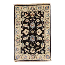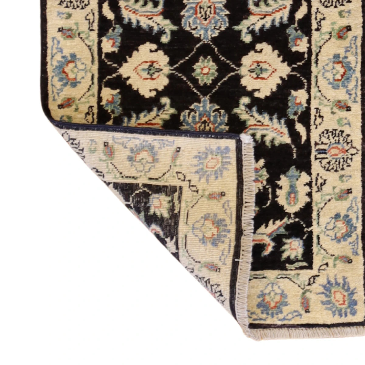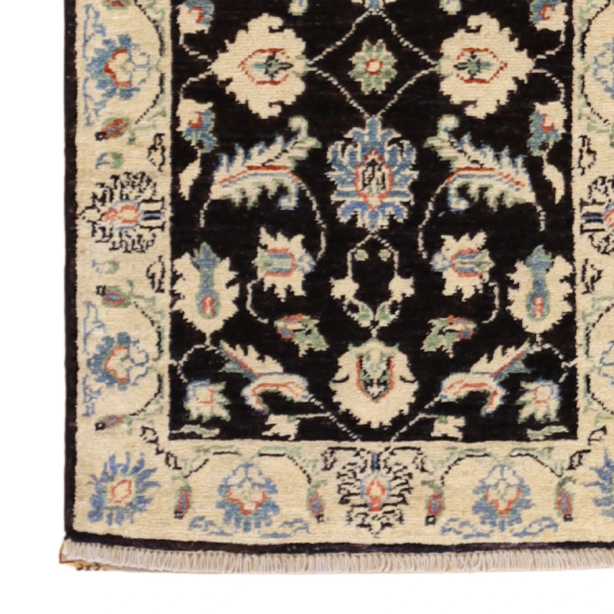 Woven from quality WOOL, this rug offers both durability and softness. The BLACK base color is accented with a subtle BEIGE border, creating a refined yet eye-catching piece.