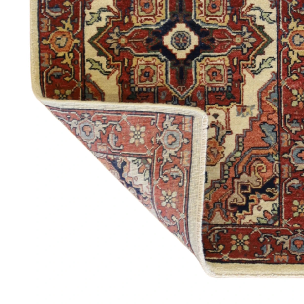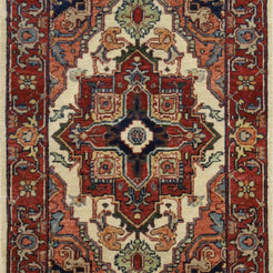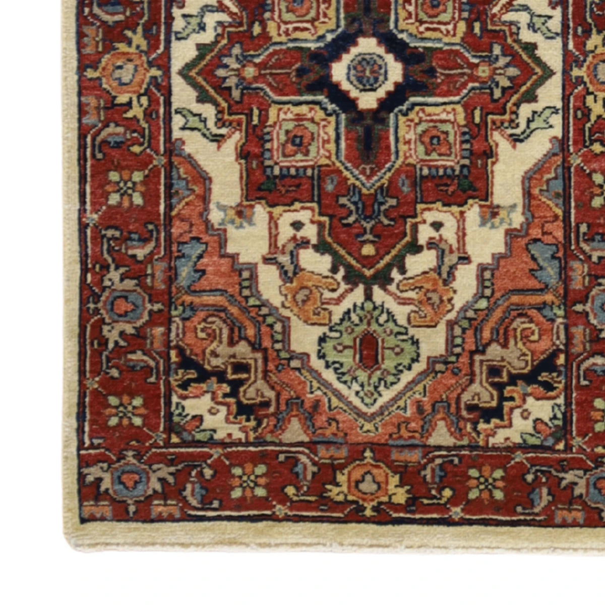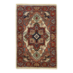 Compact in size but rich in detail, this handcrafted INDIAN SERAPI rug is designed in a stylish GEOMETRIC look. Measuring approximately 2' x 2 ft, it's perfect for small spaces like entryways, kitchens, bathrooms, or beside the bed.
