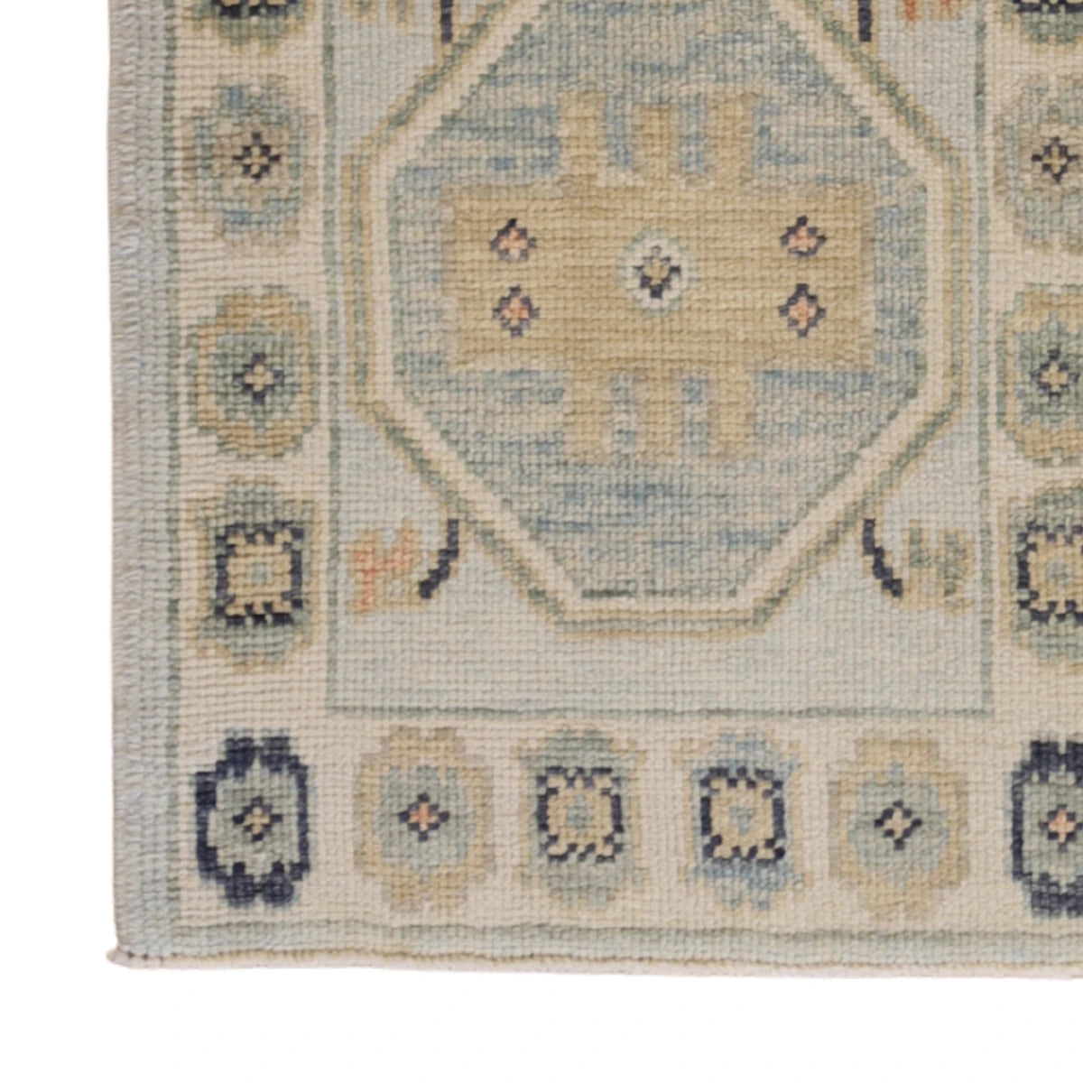 Compact in size but rich in detail, this handcrafted TURKISH OUSHAK rug is designed in a stylish GEOMETRIC look. Measuring approximately 2' x 2 ft, it's perfect for small spaces like entryways, kitchens, bathrooms, or beside the bed.