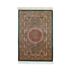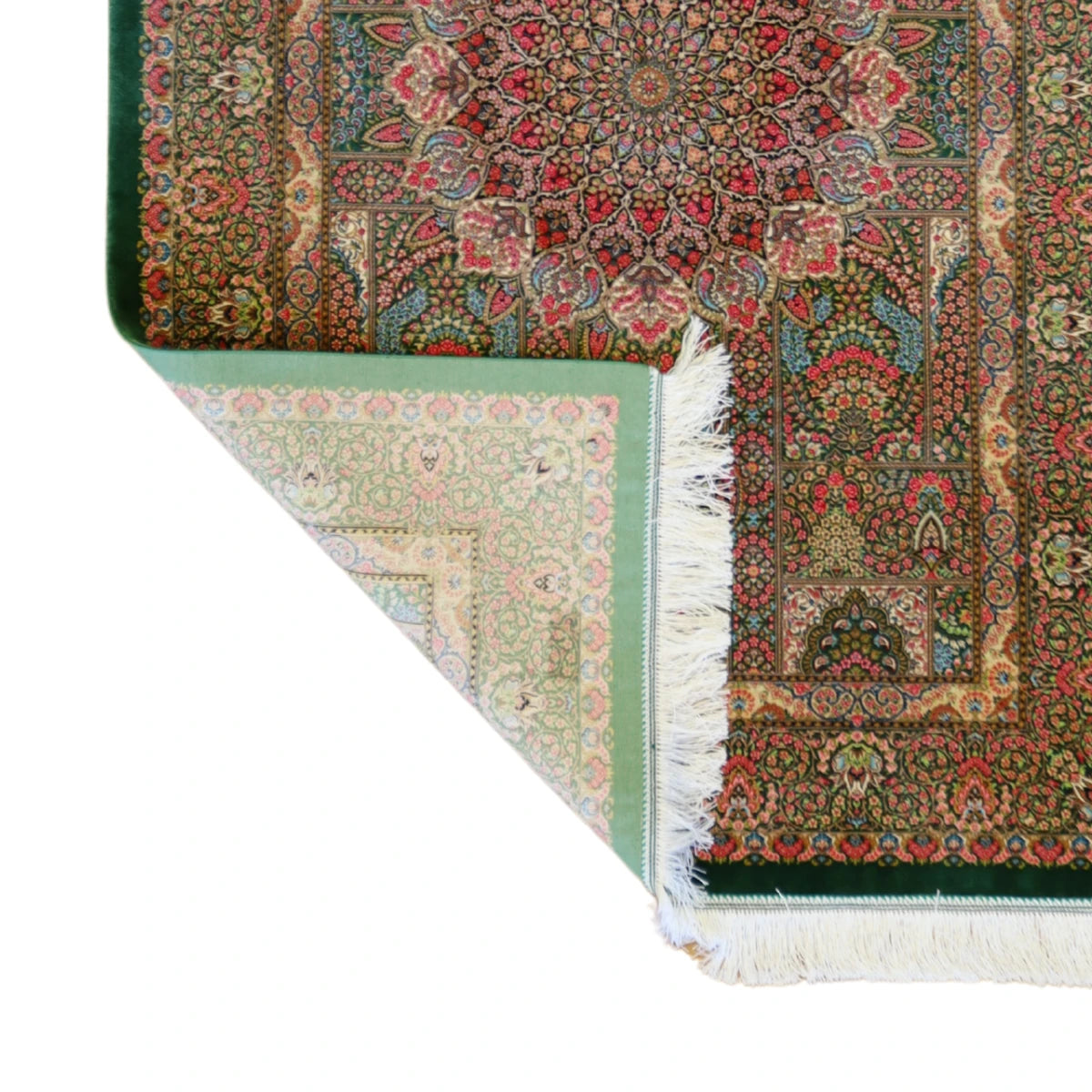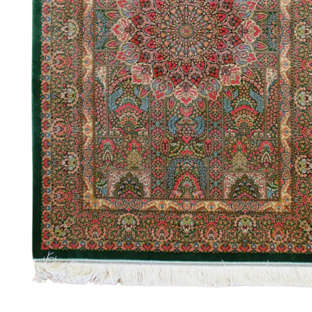 Woven from high-quality 100% SILK, this rug delivers lasting durability and a luxurious feel underfoot. The deep GREEN base color is beautifully complemented by a GREEN border, creating a striking visual balance.