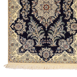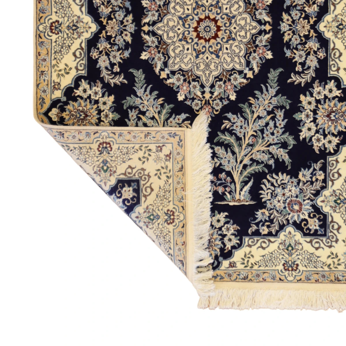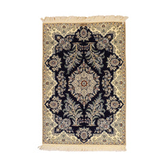 Woven from high-quality SILK&WOOL, this rug delivers lasting durability and a luxurious feel underfoot. The deep NAVY base color is beautifully complemented by a IVORY border, creating a striking visual balance.