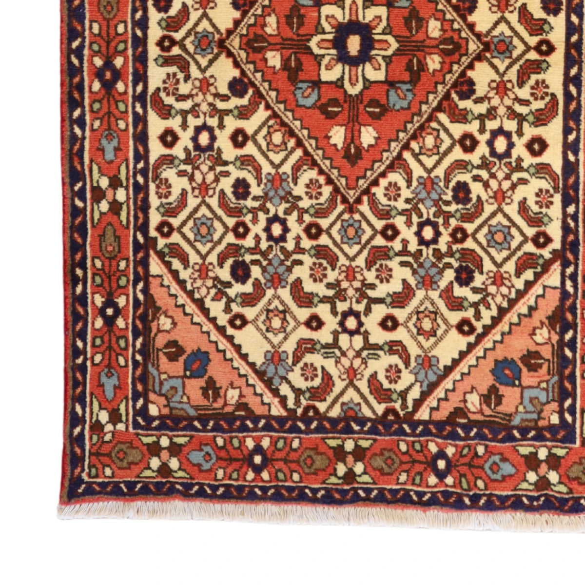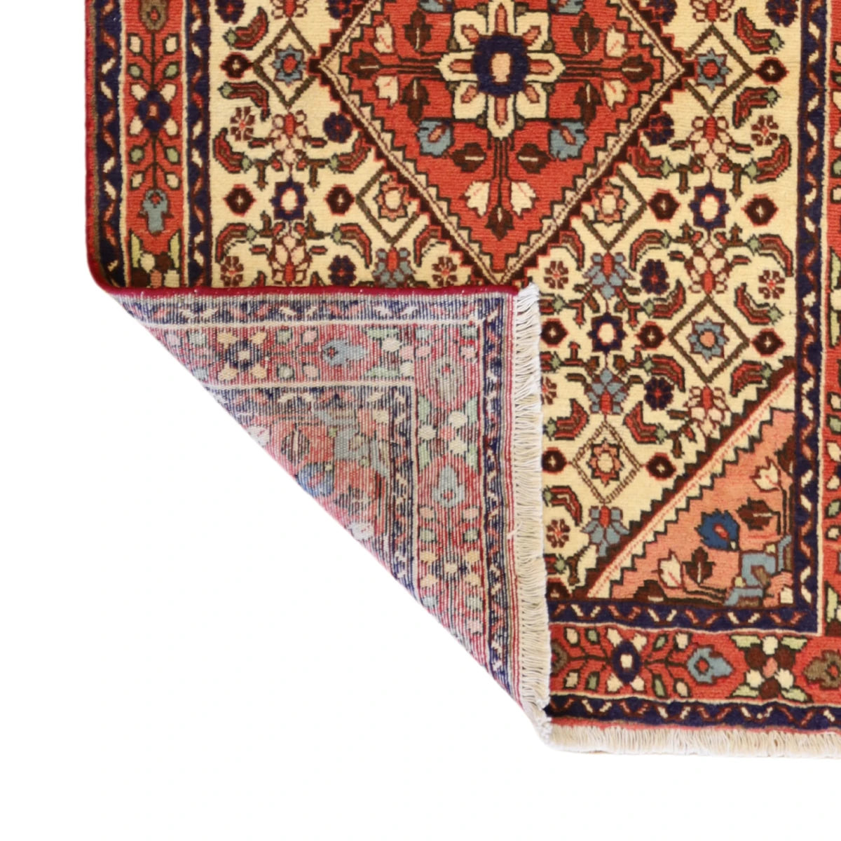 Add a touch of character and history to your home with this handcrafted vintage PERSIAN HAMEDAN rug in a timeless GEOMETRIC style. Measuring approximately 3' x 5' ft, its versatile size fits beautifully in entryways, next to the bed, under a coffee table, or in cozy reading corners.