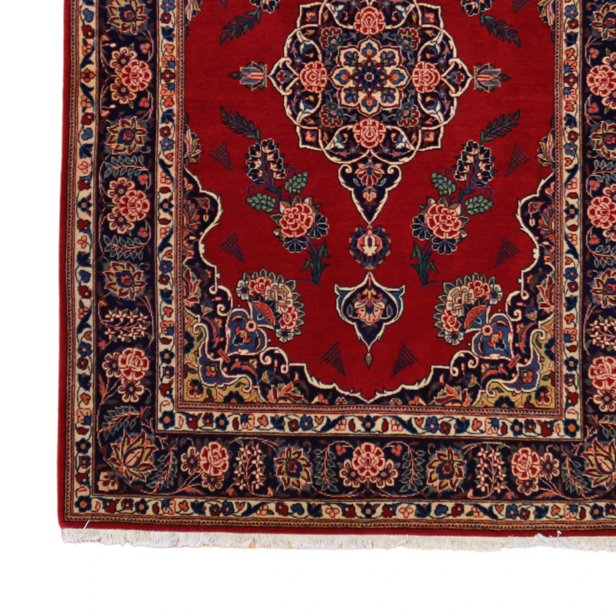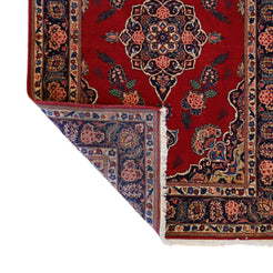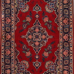 Woven from high-quality WOOL, this rug delivers lasting durability and a luxurious feel underfoot. The deep RED base color is beautifully complemented by a NAVY border, creating a striking visual balance.