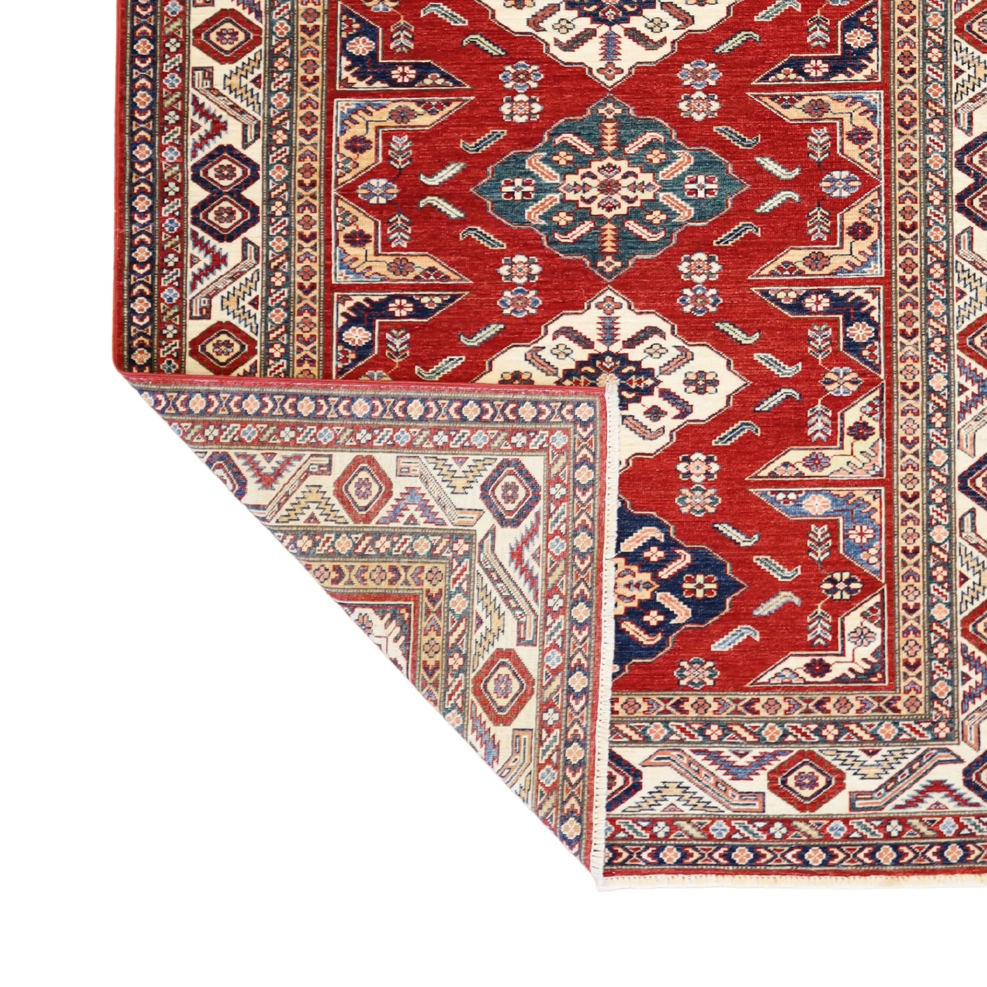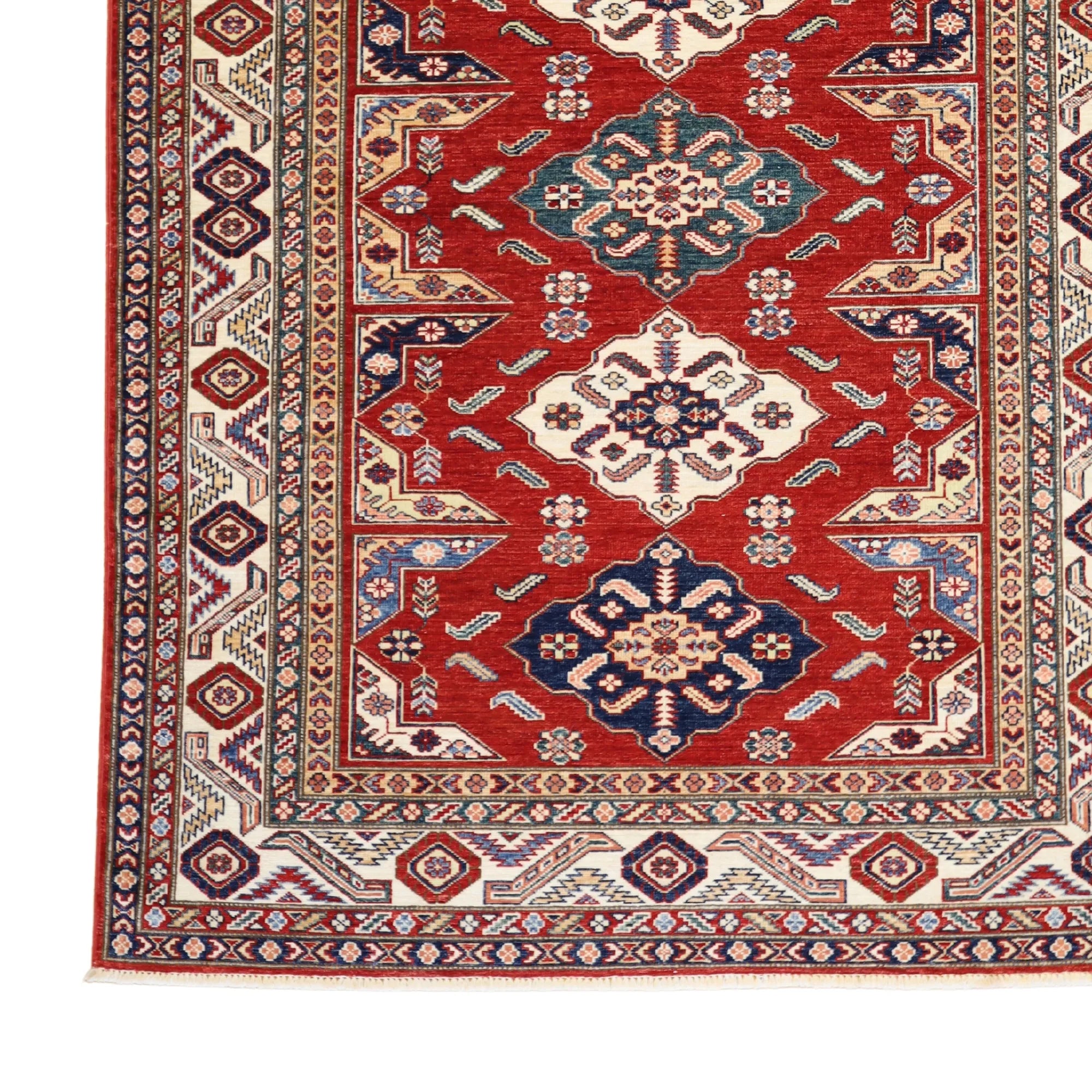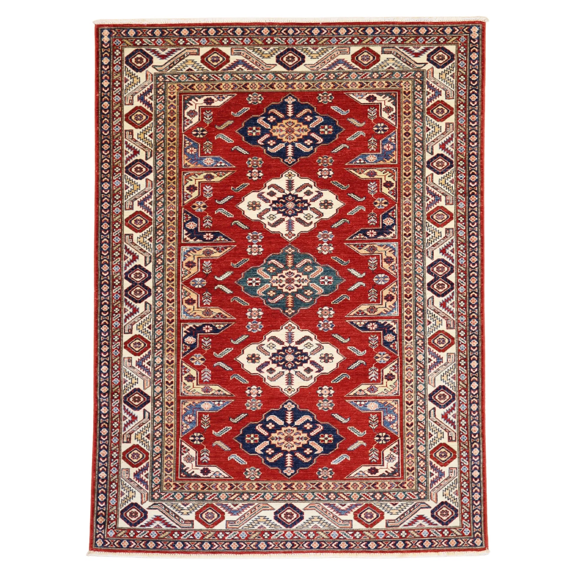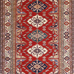 Add a Bold Touch with GEOMETRIC Style. This stunning KAZAK rug, crafted in a striking geometric style, brings a modern and bold look to your home. The clean, sharp lines and symmetrical patterns on the RED base create a dynamic visual effect, making this rug a perfect statement piece. The contrasting BEIGE border adds a touch of sophistication, enhancing the overall design. Whether placed in your living room, office, or any open space, the geometric pattern brings structure and energy to the decor. This handmade PAKISTANI, rug is a long-lasting investment in craftsmanship and style. Measuring 4' 11" x 6' 8", it not only elevates your space but is built to stand the test of time.