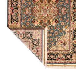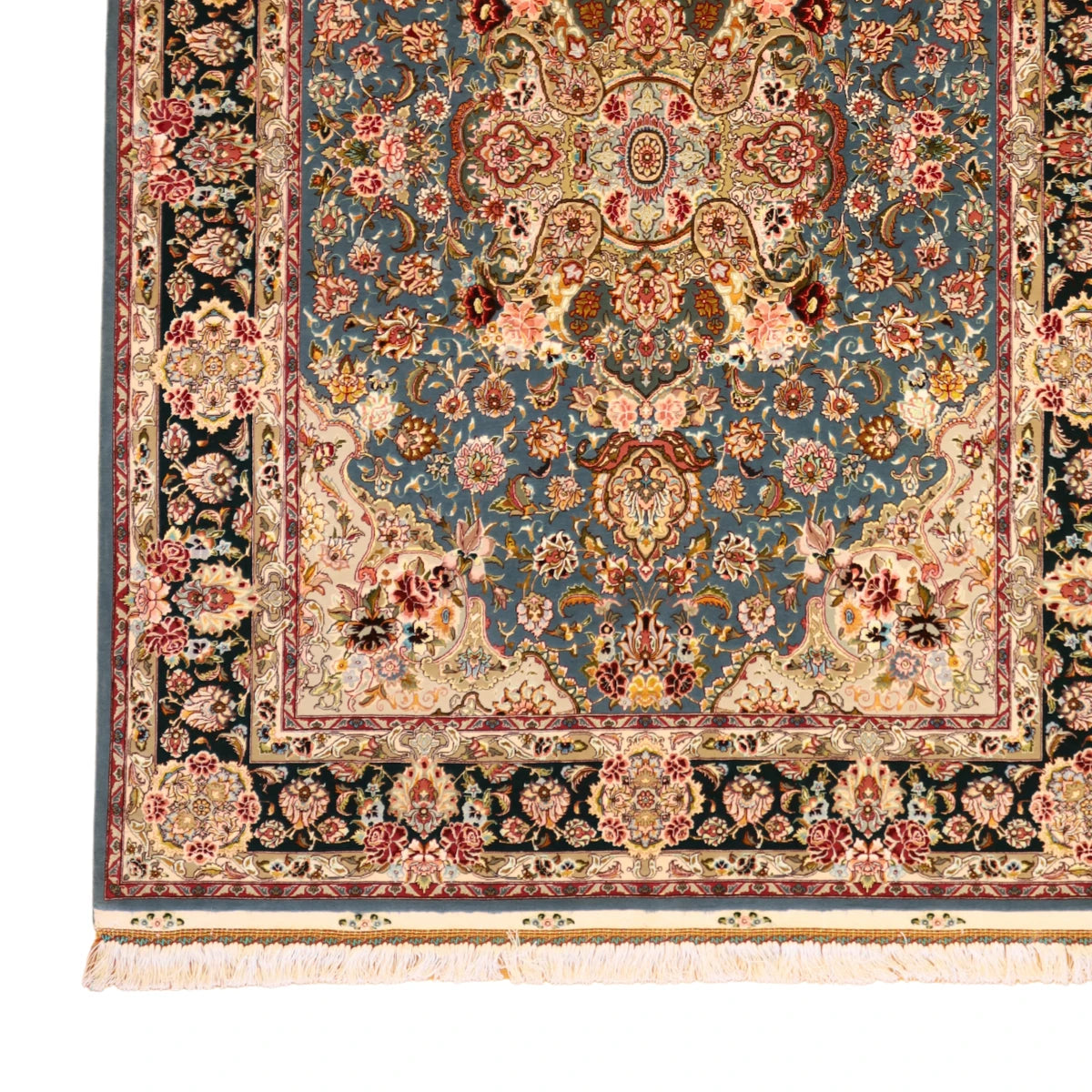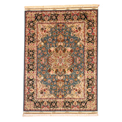 Woven from high-quality SILK&WOOL, this rug delivers lasting durability and a luxurious feel underfoot. The deep BLUE base color is beautifully complemented by a GREEN border, creating a striking visual balance.