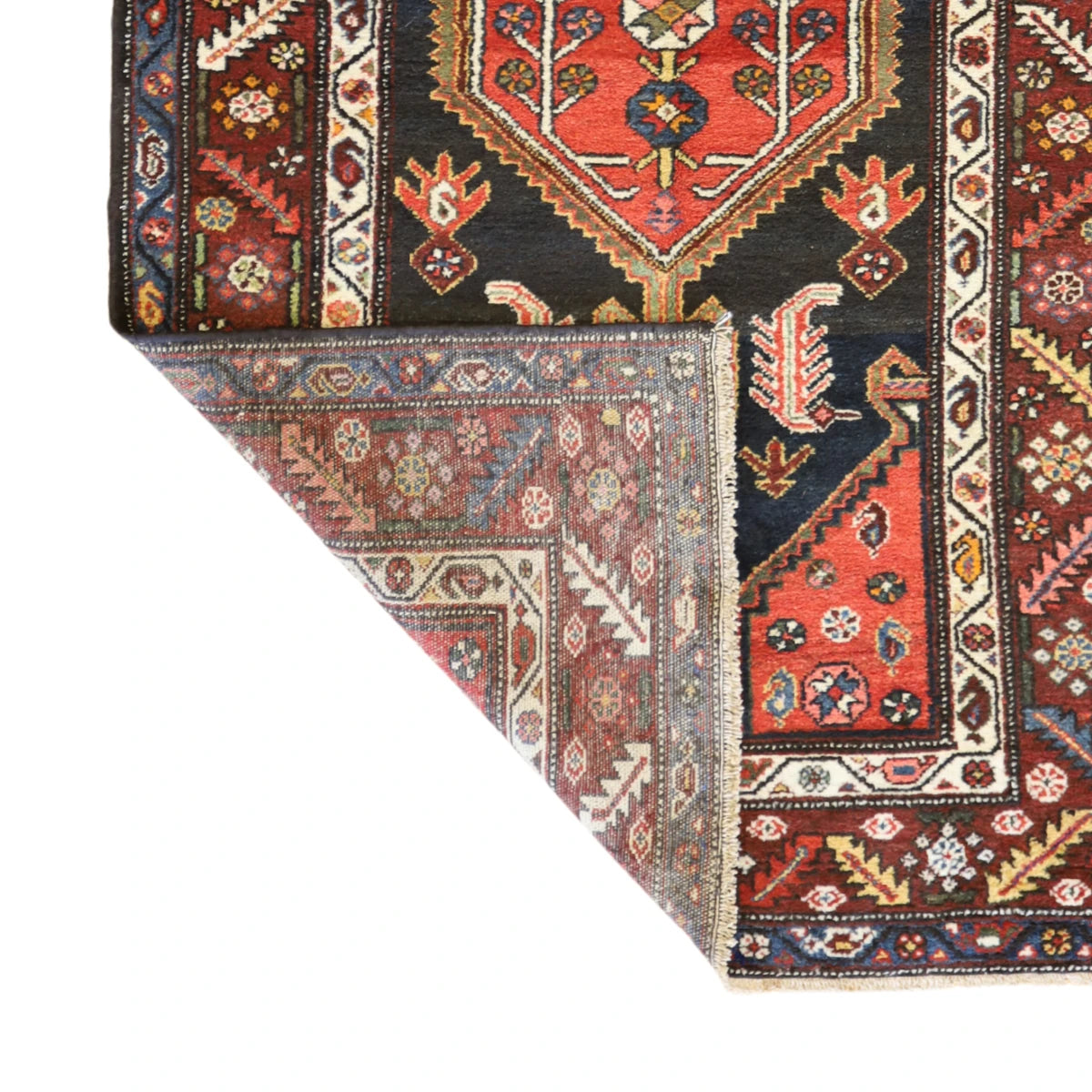 Add a touch of character and history to your home with this handcrafted vintage PERSIAN HAMEDAN rug in a timeless ANTIQUE style. Measuring approximately 4' x 6' ft, its versatile size fits beautifully in entryways, next to the bed, under a coffee table, or in cozy reading corners.