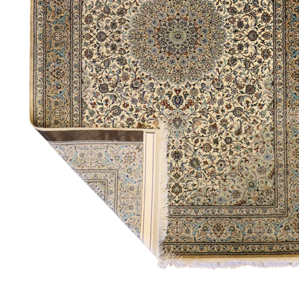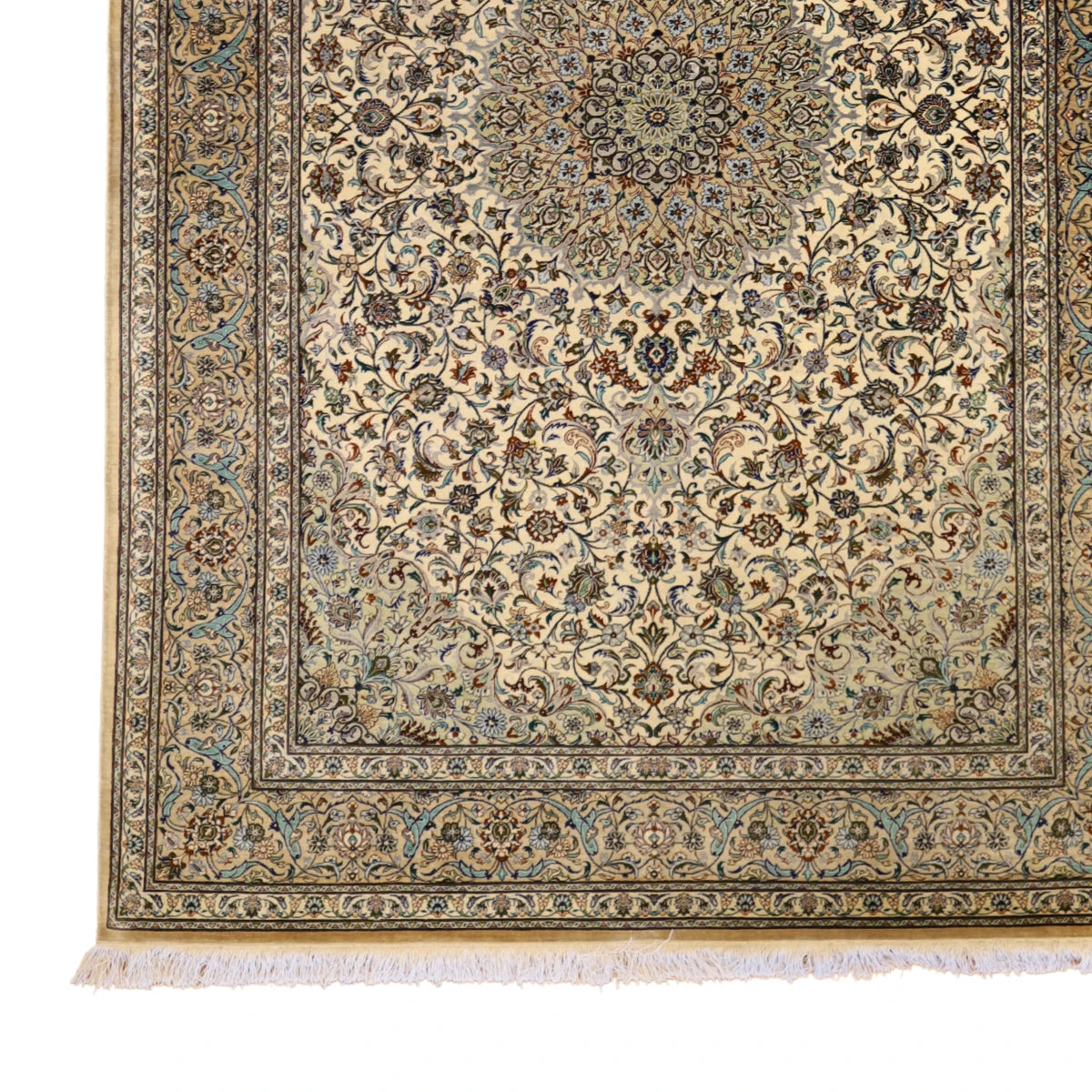Woven from high-quality 100% SILK, this rug delivers lasting durability and a luxurious feel underfoot. The deep IVORY base color is beautifully complemented by a BEIGE border, creating a striking visual balance.