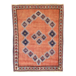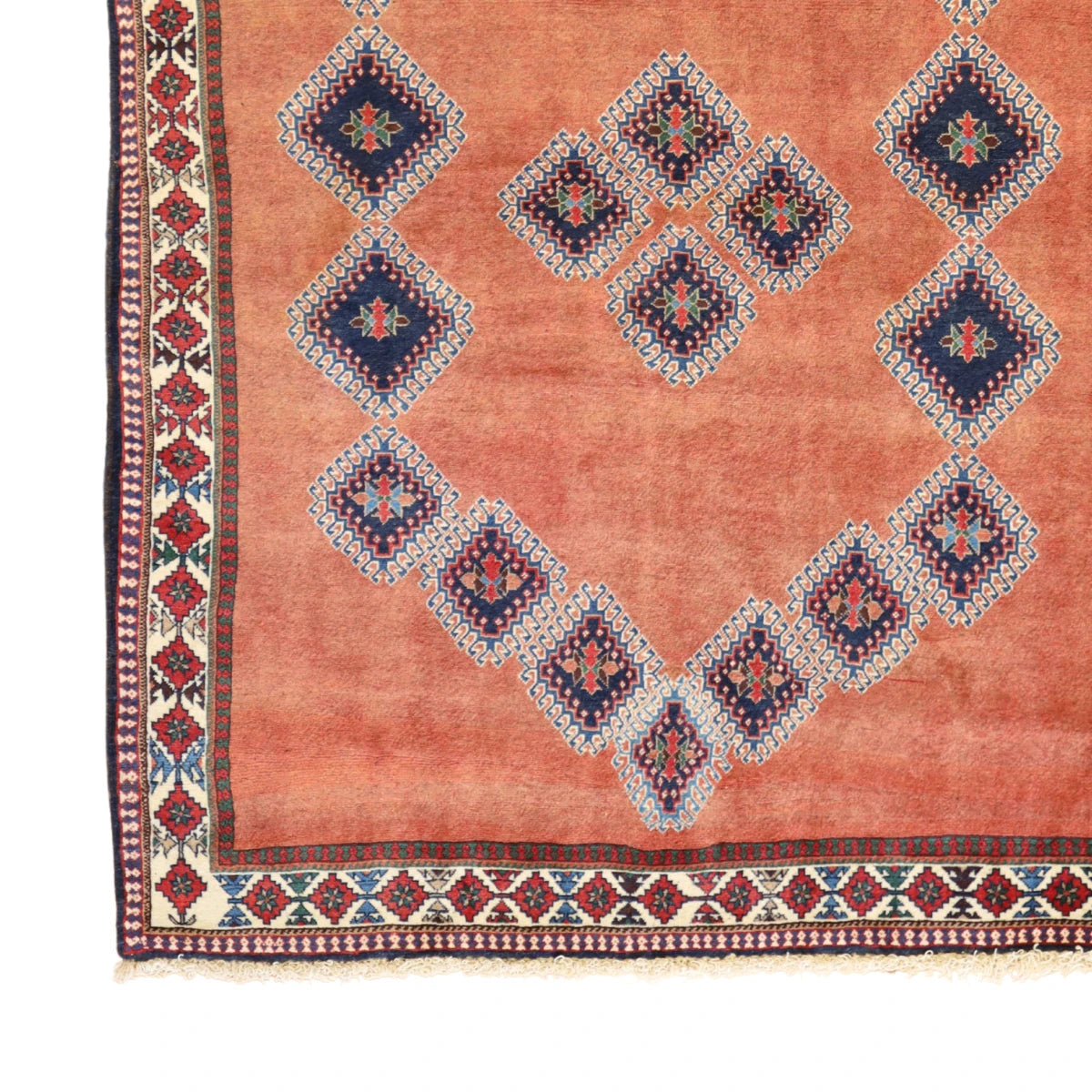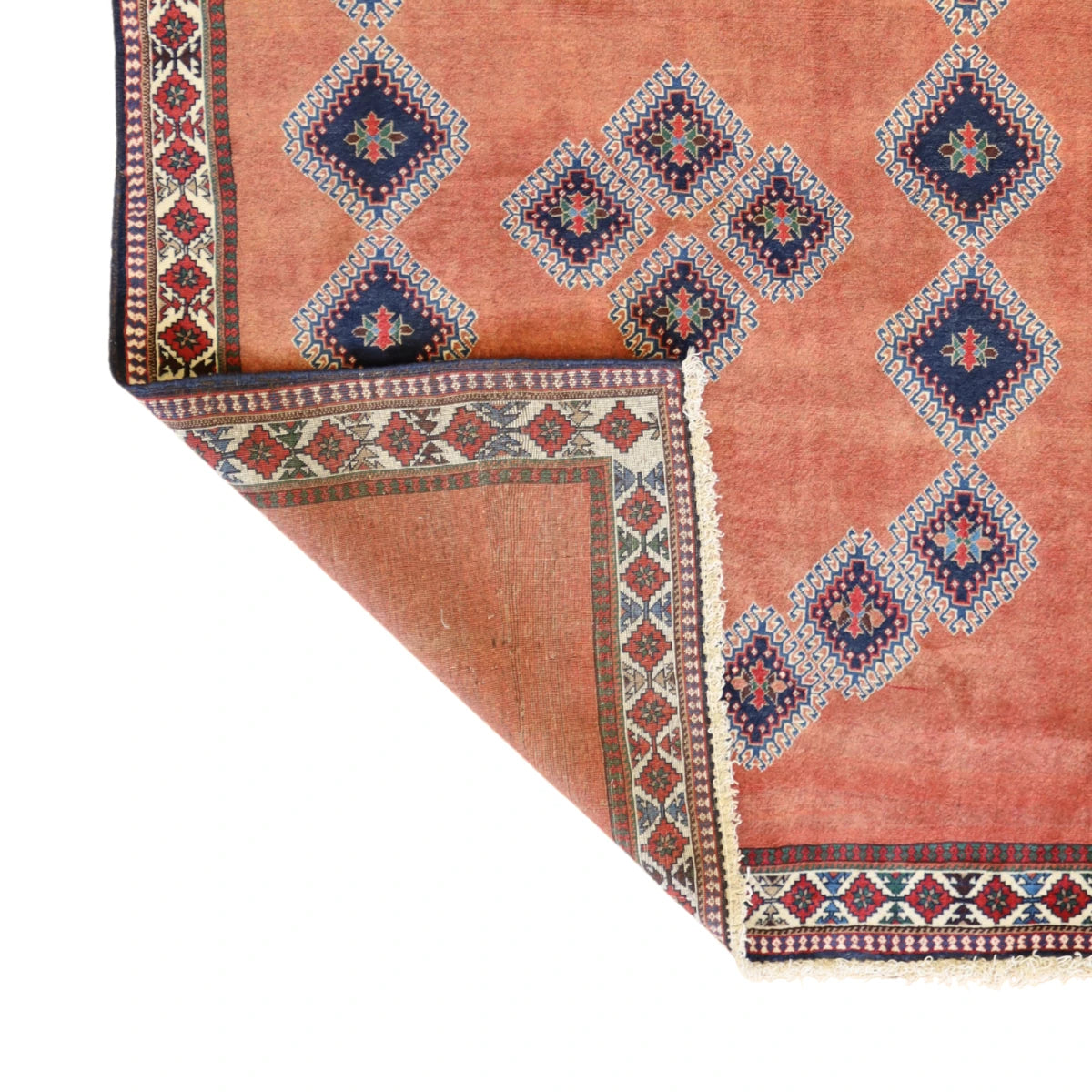 Add a touch of character and history to your home with this handcrafted vintage PERSIAN YALAMEH rug in a timeless GEOMETRIC style. Measuring approximately 4' x 6' ft, its versatile size fits beautifully in entryways, next to the bed, under a coffee table, or in cozy reading corners.