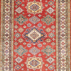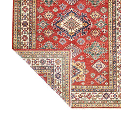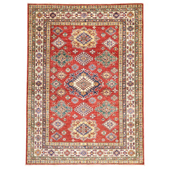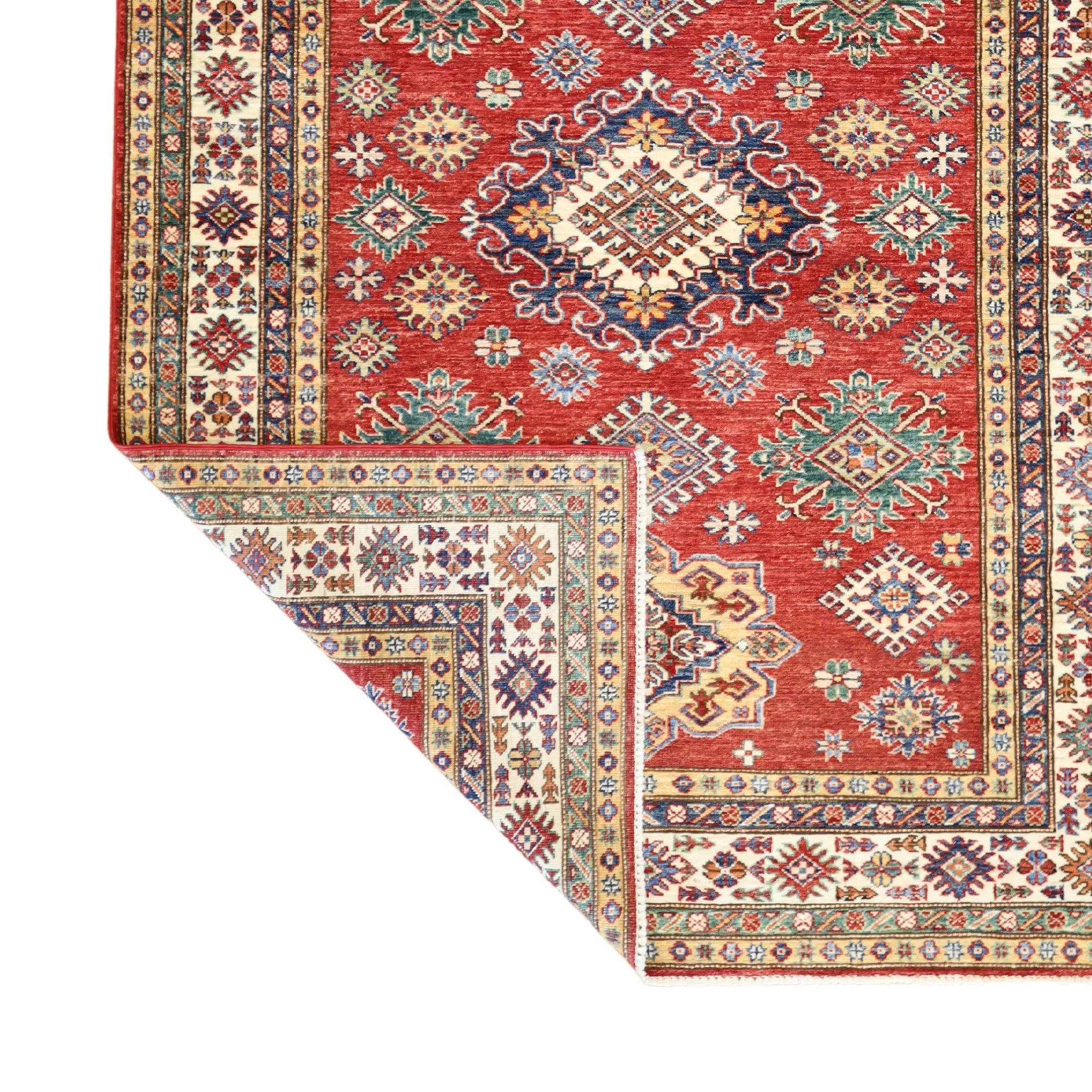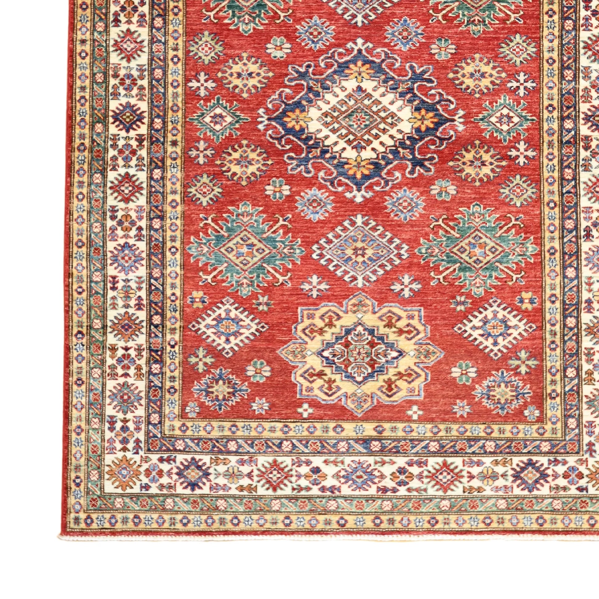 Add a Bold Touch with GEOMETRIC Style. This stunning KAZAK rug, crafted in a striking geometric style, brings a modern and bold look to your home. The clean, sharp lines and symmetrical patterns on the RED base create a dynamic visual effect, making this rug a perfect statement piece. The contrasting IVORY border adds a touch of sophistication, enhancing the overall design. Whether placed in your living room, office, or any open space, the geometric pattern brings structure and energy to the decor. This handmade PAKISTANI, rug is a long-lasting investment in craftsmanship and style. Measuring 5' 0" x 7' 0", it not only elevates your space but is built to stand the test of time.