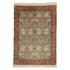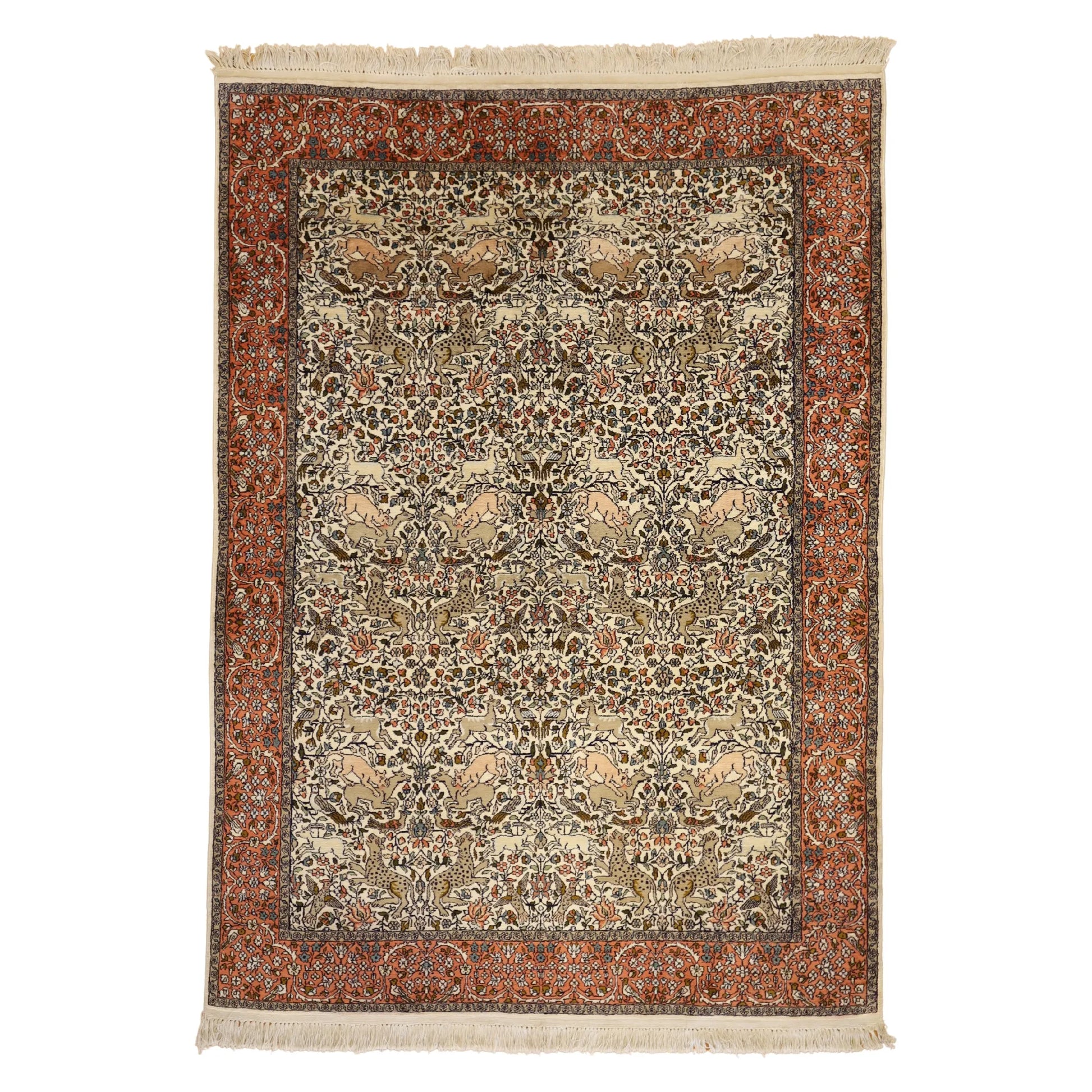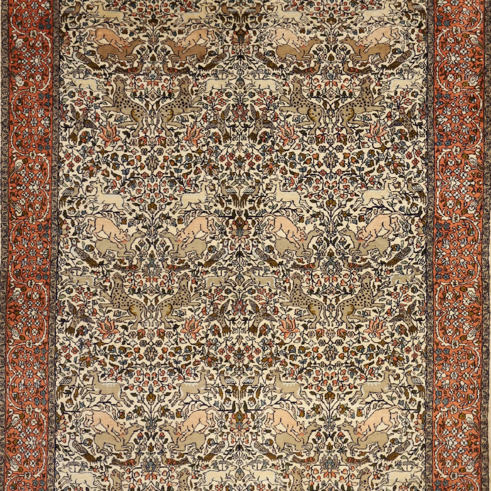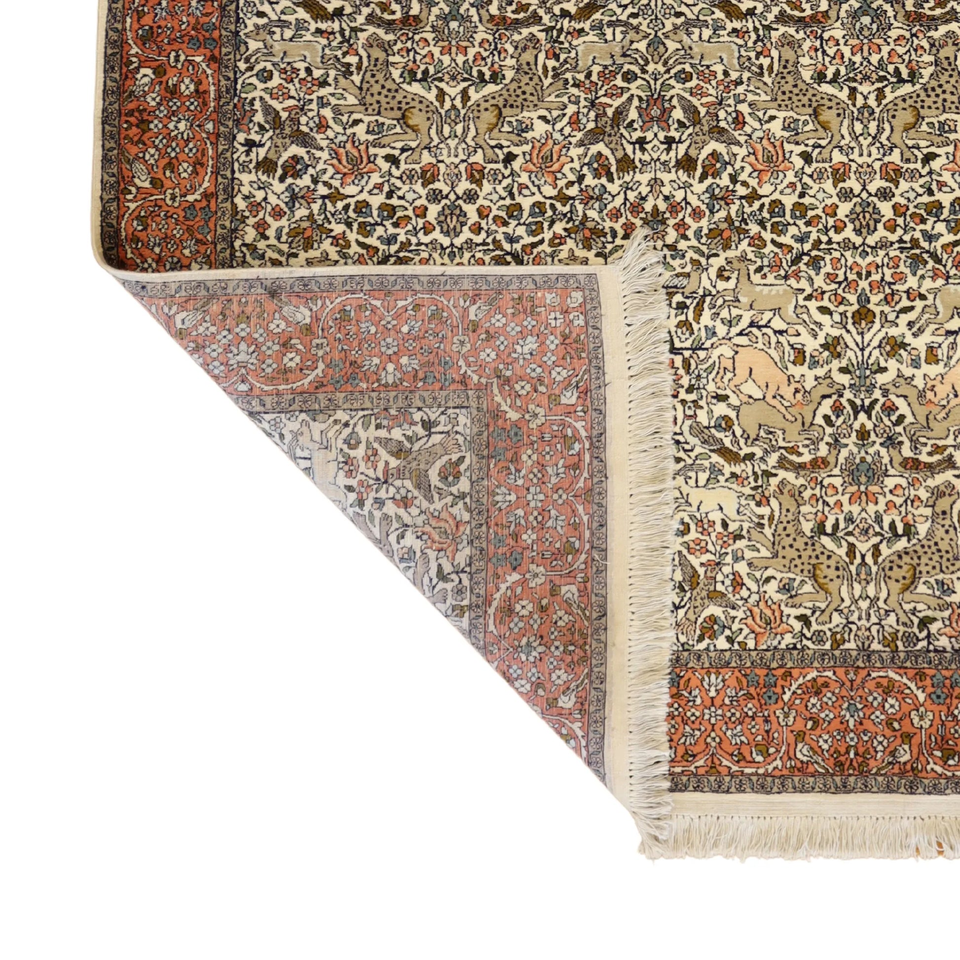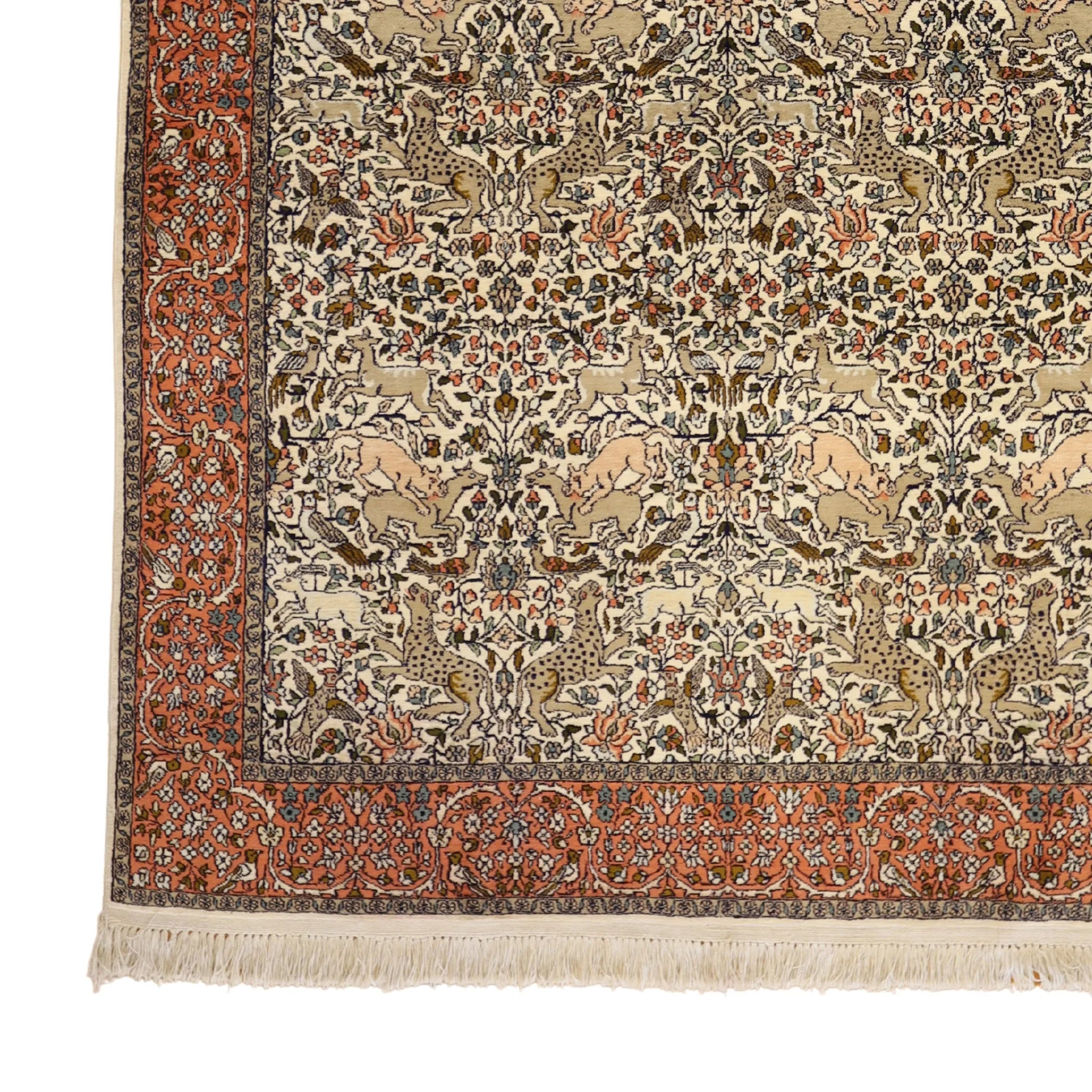 Add a Bold Touch with HUNT SCENE Style. This stunning KASHMAR rug, crafted in a striking geometric style, brings a modern and bold look to your home. The clean, sharp lines and symmetrical patterns on the WHITE base create a dynamic visual effect, making this rug a perfect statement piece. The contrasting PEACH border adds a touch of sophistication, enhancing the overall design. Whether placed in your living room, office, or any open space, the geometric pattern brings structure and energy to the decor. This handmade INDIAN, rug is a long-lasting investment in craftsmanship and style. Measuring 5' 0" x 7' 0", it not only elevates your space but is built to stand the test of time.