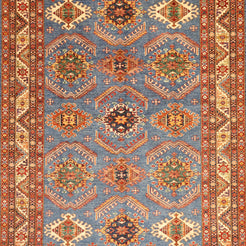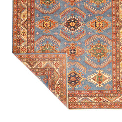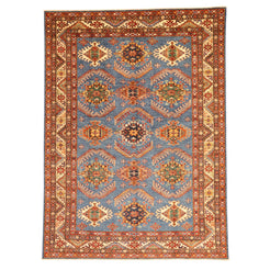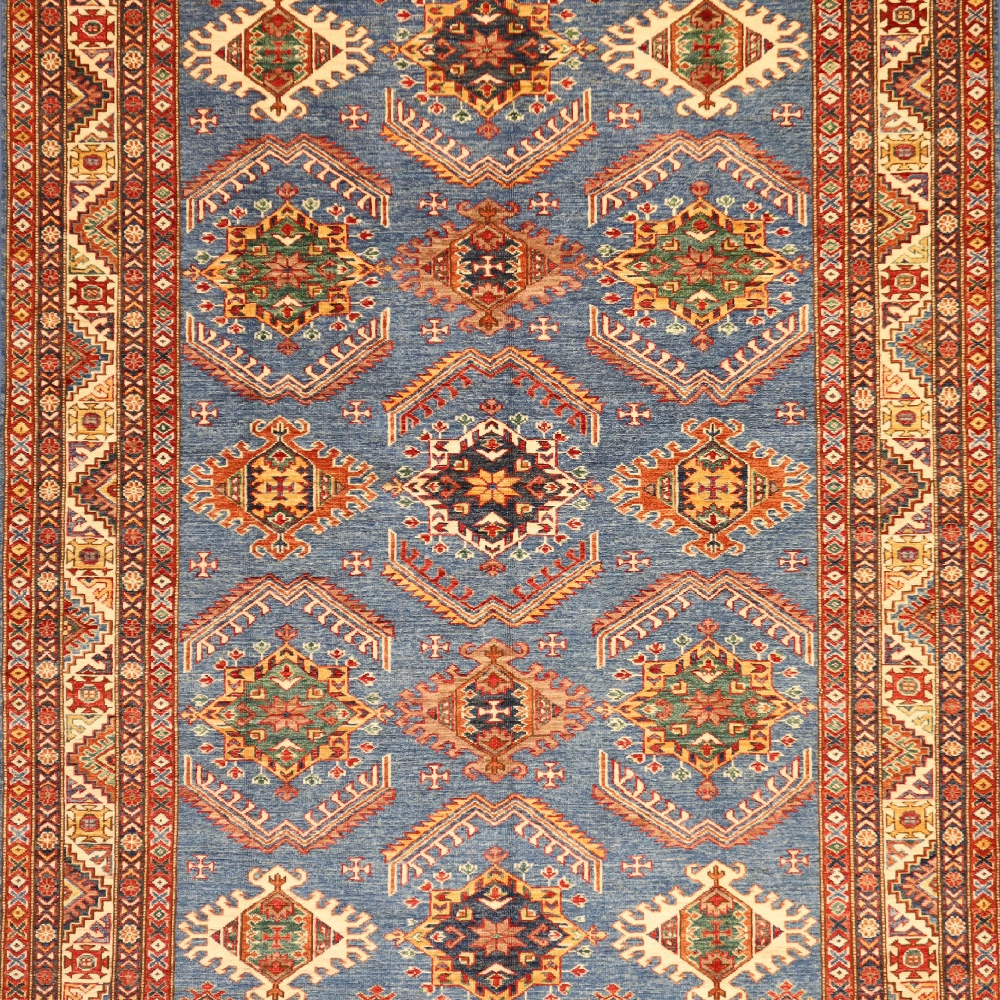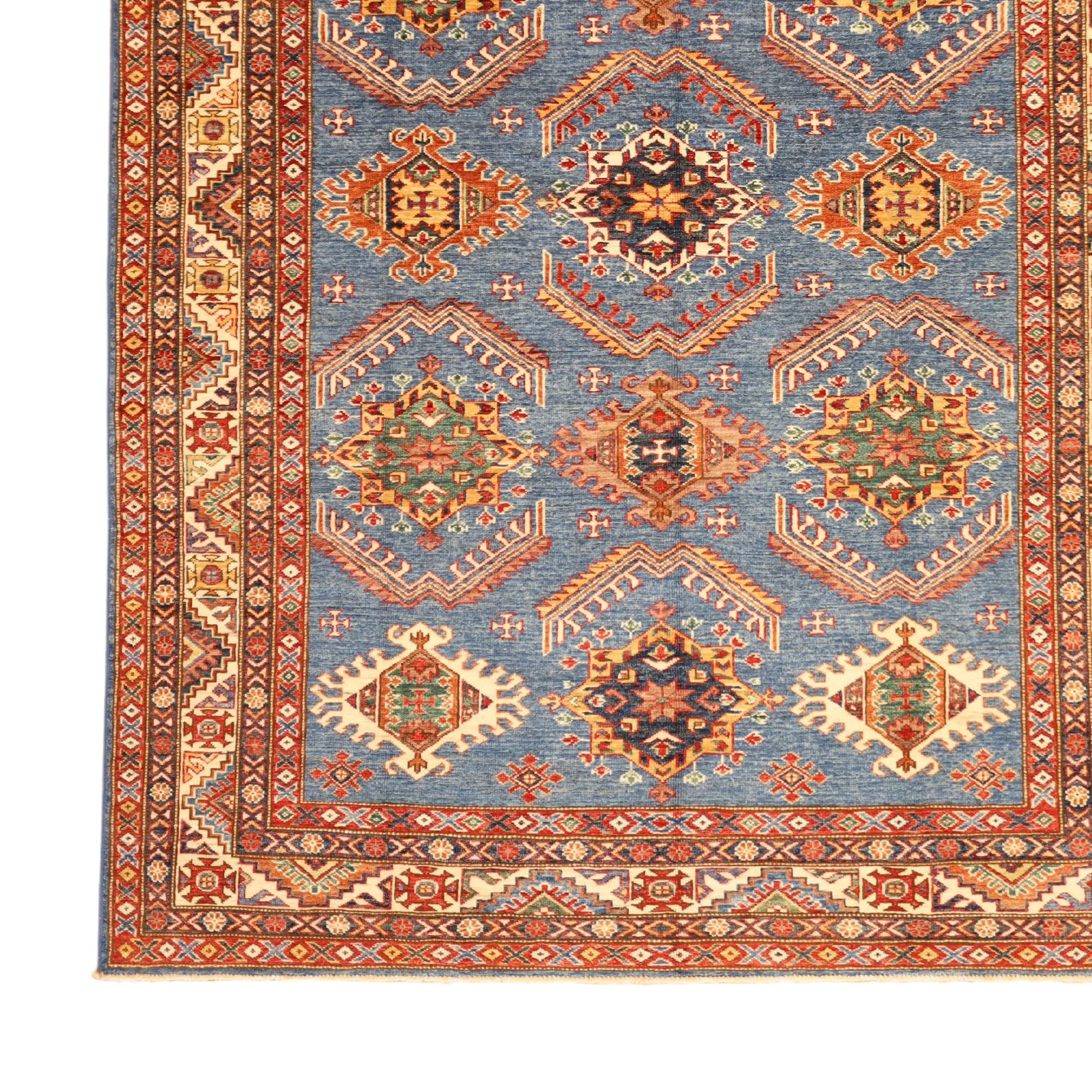 Add a Bold Touch with GEOMETRIC Style. This stunning KAZAK rug, crafted in a striking geometric style, brings a modern and bold look to your home. The clean, sharp lines and symmetrical patterns on the BLUE base create a dynamic visual effect, making this rug a perfect statement piece. The contrasting IVORY border adds a touch of sophistication, enhancing the overall design. Whether placed in your living room, office, or any open space, the geometric pattern brings structure and energy to the decor. This handmade PAKISTANI, rug is a long-lasting investment in craftsmanship and style. Measuring 5' 11" x 8' 0", it not only elevates your space but is built to stand the test of time.