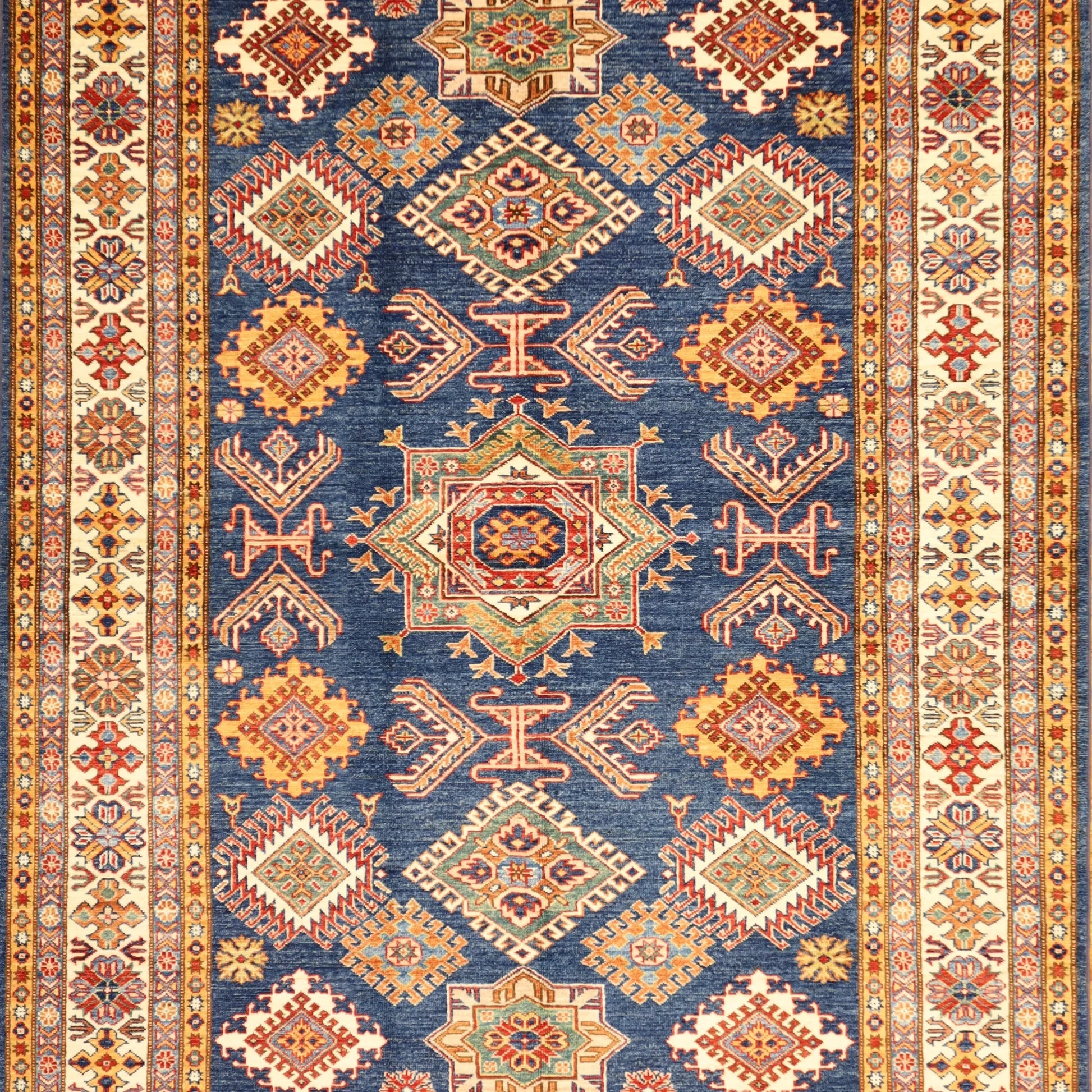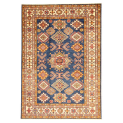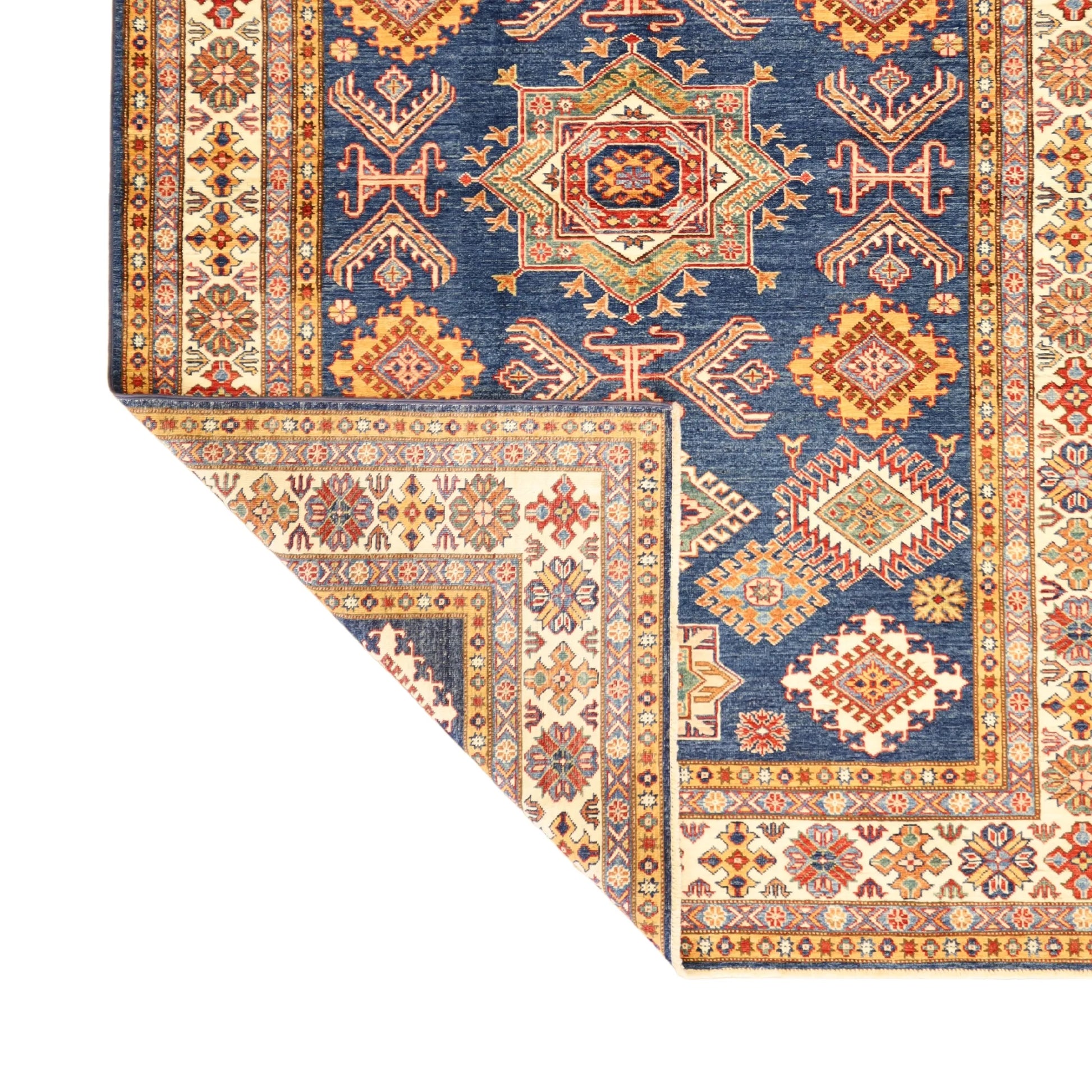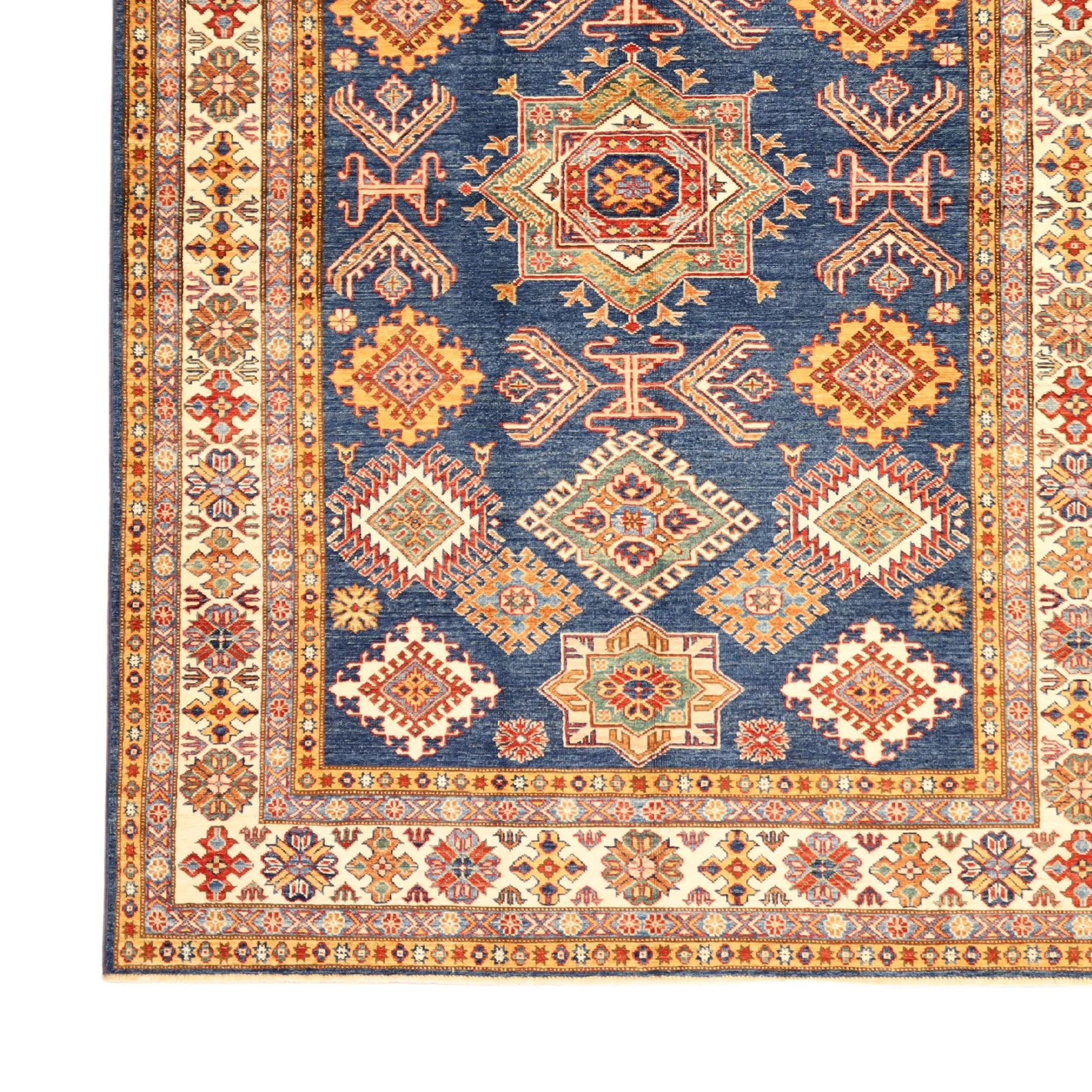 Add a Bold Touch with GEOMETRIC Style. This stunning KAZAK rug, crafted in a striking geometric style, brings a modern and bold look to your home. The clean, sharp lines and symmetrical patterns on the NAVY base create a dynamic visual effect, making this rug a perfect statement piece. The contrasting IVORY border adds a touch of sophistication, enhancing the overall design. Whether placed in your living room, office, or any open space, the geometric pattern brings structure and energy to the decor. This handmade PAKISTANI, rug is a long-lasting investment in craftsmanship and style. Measuring 5' 8" x 8' 0", it not only elevates your space but is built to stand the test of time.