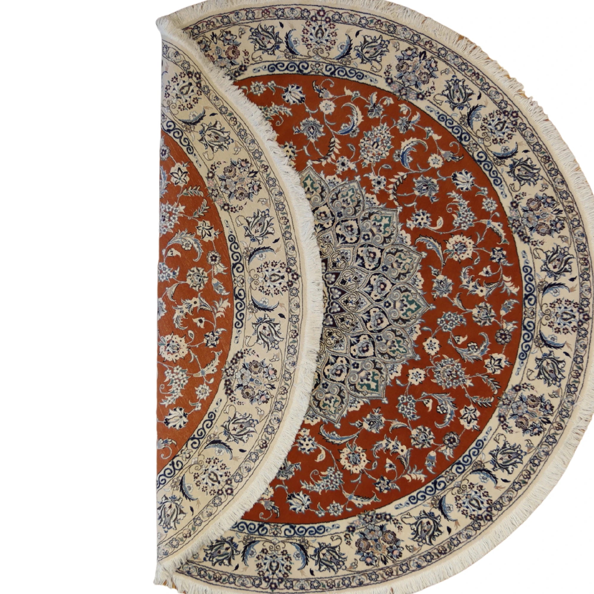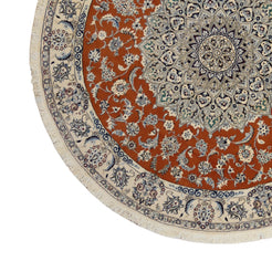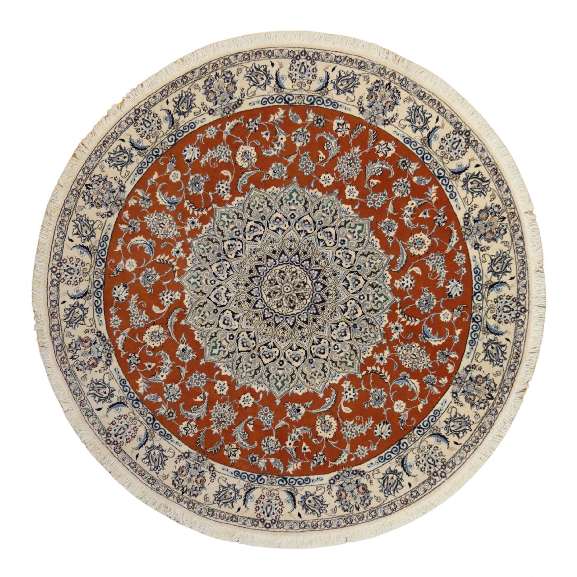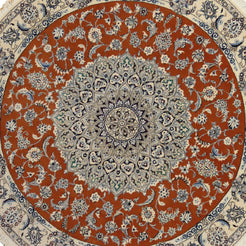 Add softness and style to your space with this handcrafted round PERSIAN NAEIN rug, designed in a timeless FLORAL look. Measuring approximately 6' x 6 ft, it's perfect for under coffee tables, in reading nooks, entryways, or anywhere you want a cozy focal point.
