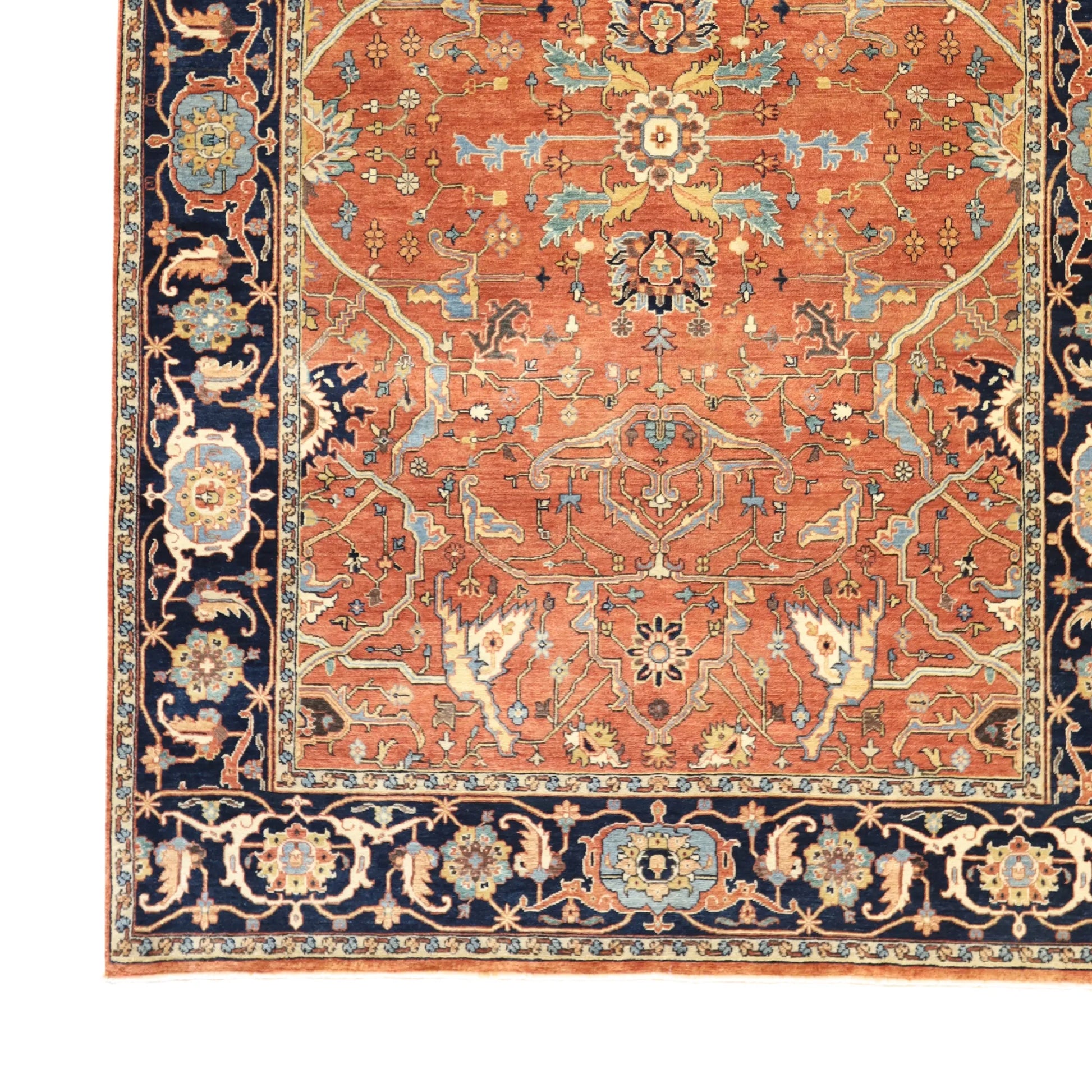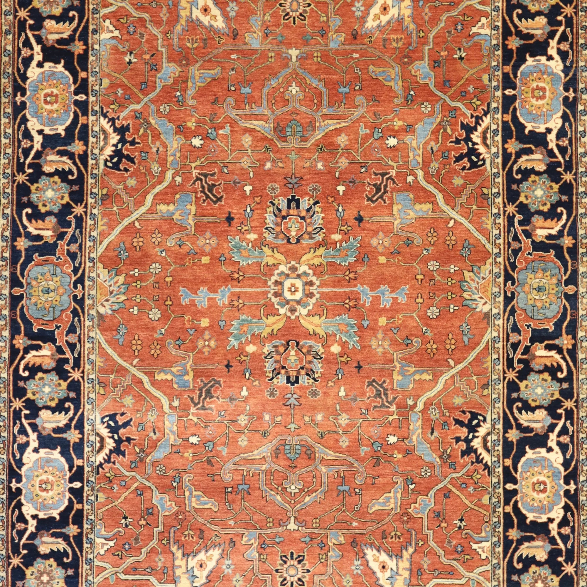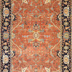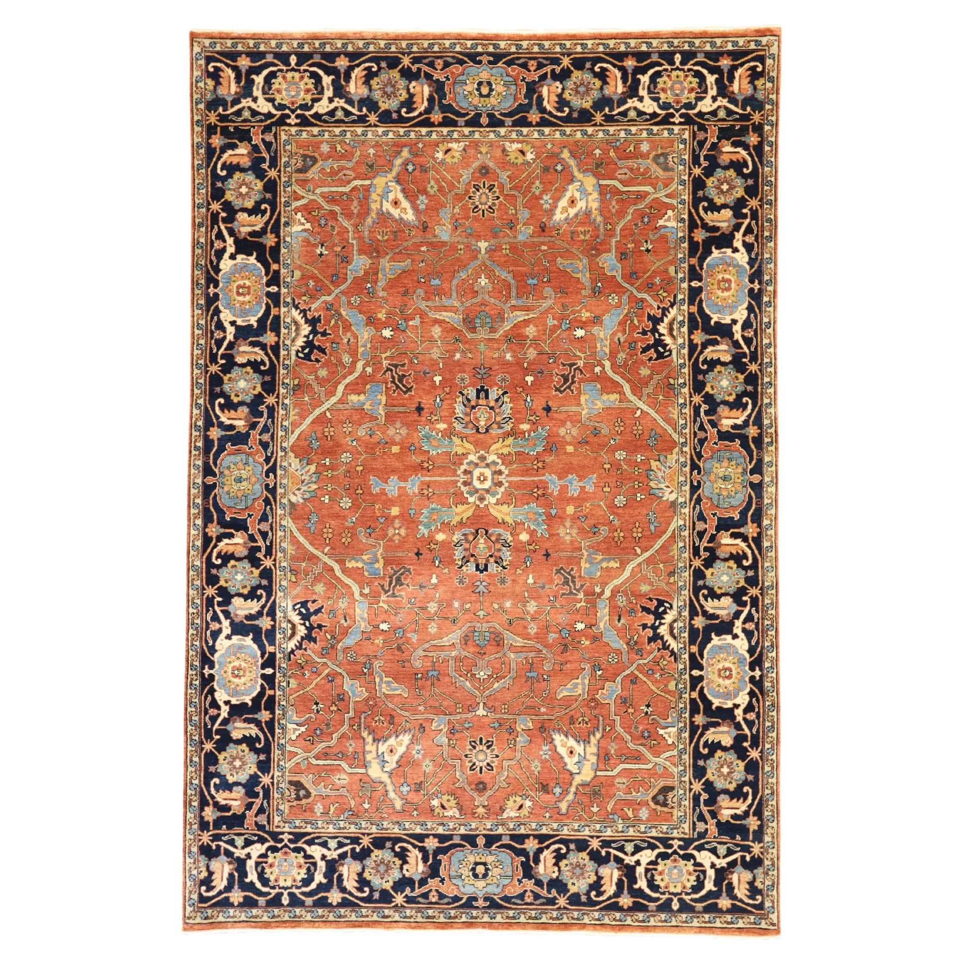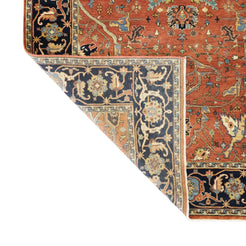 Add a Bold Touch with GEOMETRIC Style. This stunning SERAPI rug, crafted in a striking geometric style, brings a modern and bold look to your home. The clean, sharp lines and symmetrical patterns on the RED base create a dynamic visual effect, making this rug a perfect statement piece. The contrasting NAVY border adds a touch of sophistication, enhancing the overall design. Whether placed in your living room, office, or any open space, the geometric pattern brings structure and energy to the decor. This handmade INDIAN, rug is a long-lasting investment in craftsmanship and style. Measuring 6' 0" x 9' 2", it not only elevates your space but is built to stand the test of time.