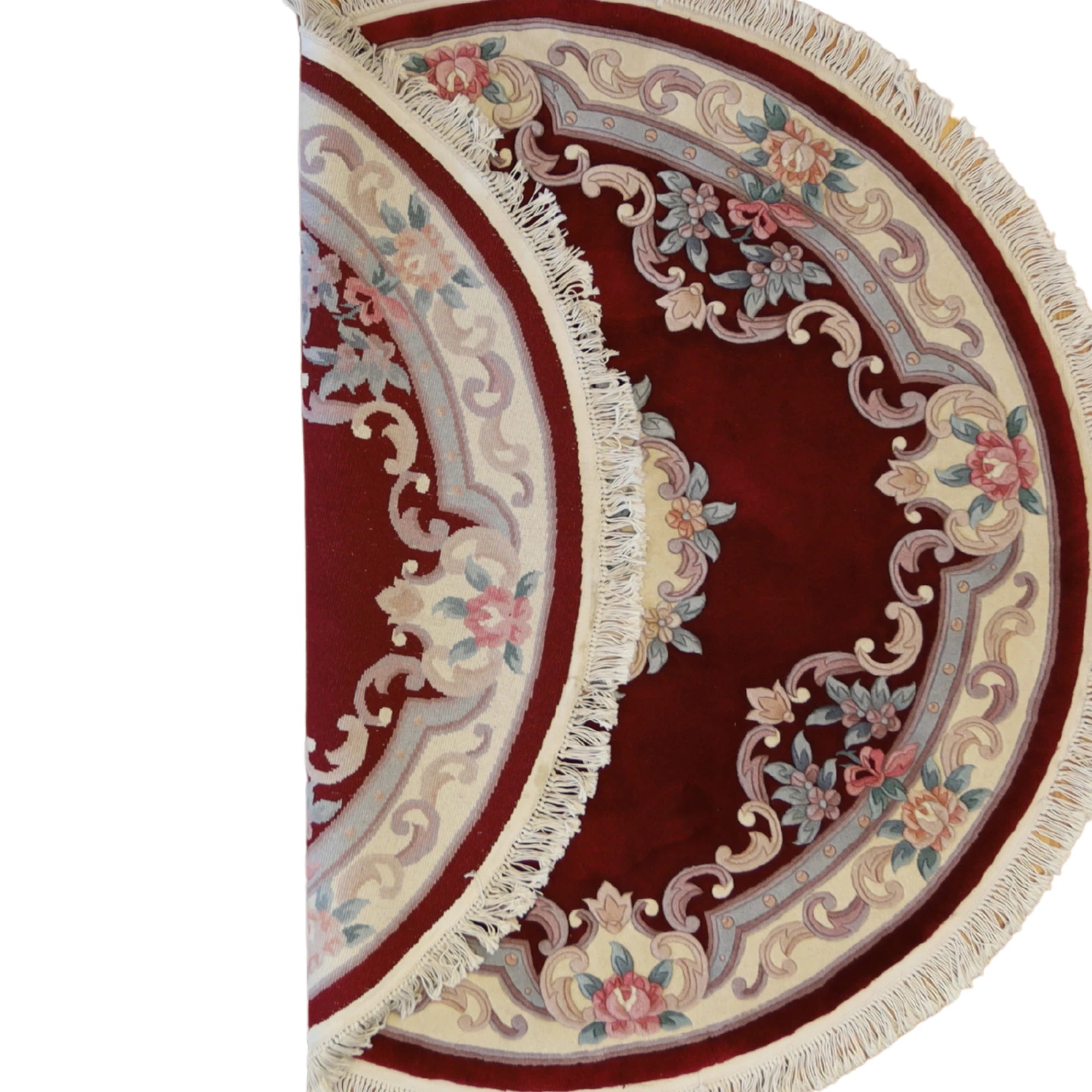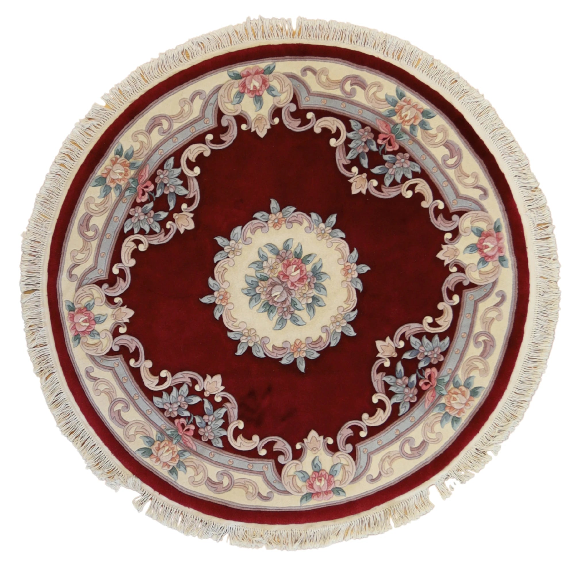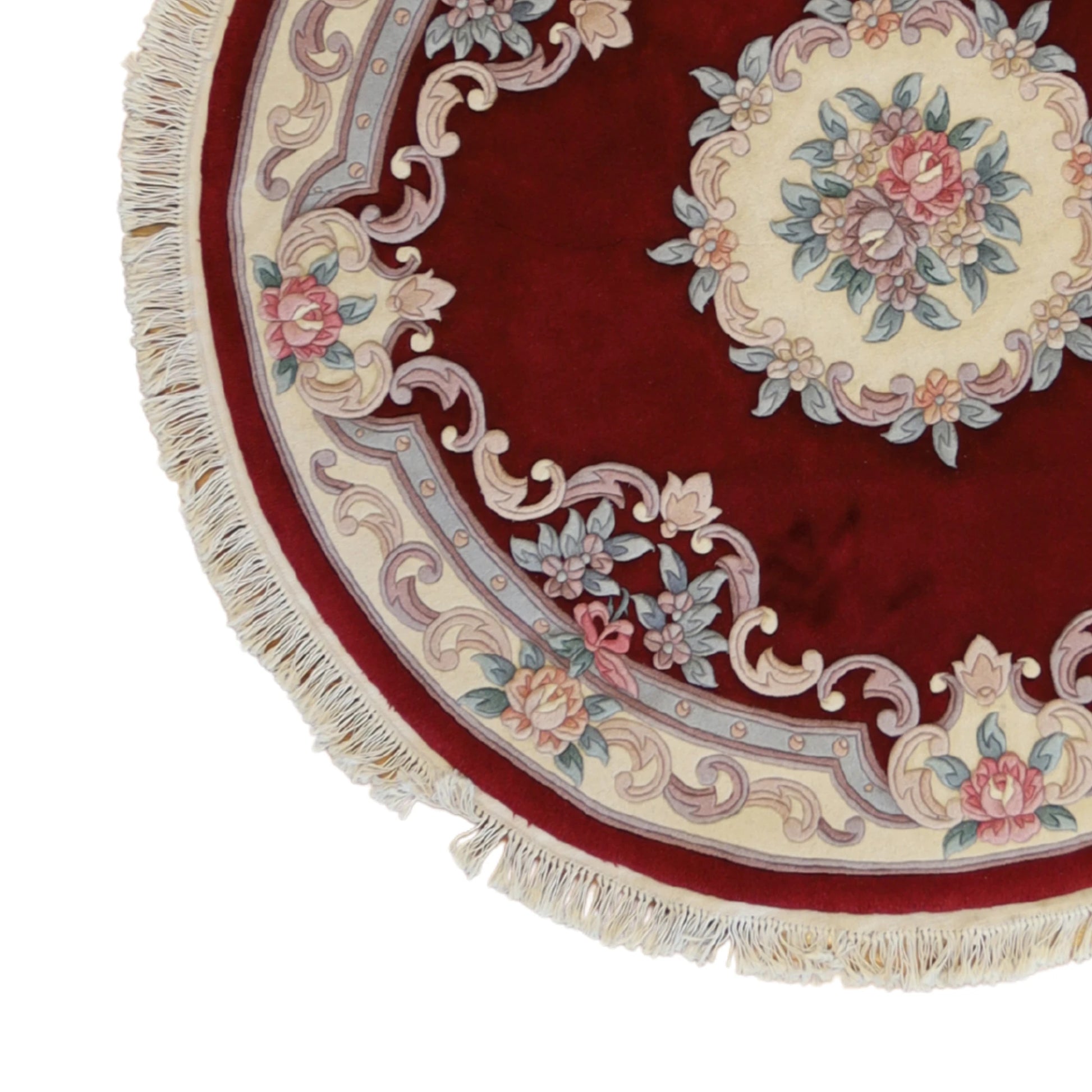 Add softness and style to your space with this handcrafted round CHINESE AUBUSSON rug, designed in a timeless FRENCH look. Measuring approximately 5' x 5 ft, it's perfect for under coffee tables, in reading nooks, entryways, or anywhere you want a cozy focal point.