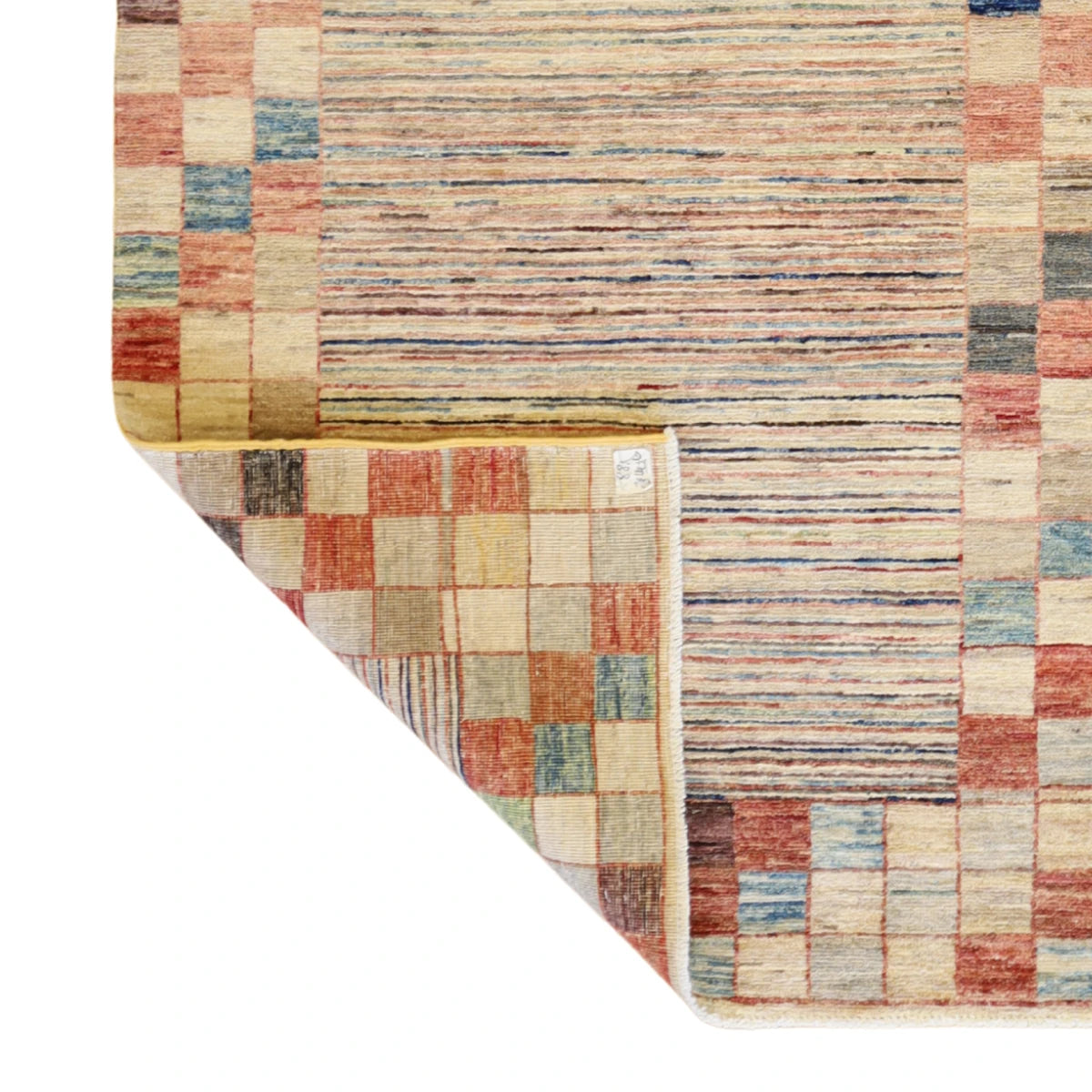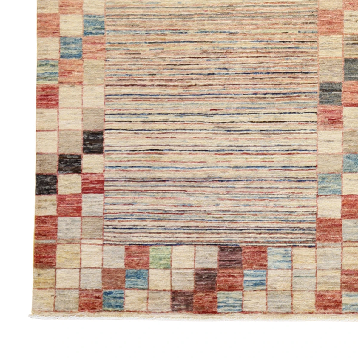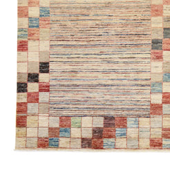 Made from premium WOOL, it offers a blend of lasting durability and a soft, comfortable feel. The deep BEIGE base is elegantly framed with a MULTICOLOR border, creating a balanced and stylish look.
