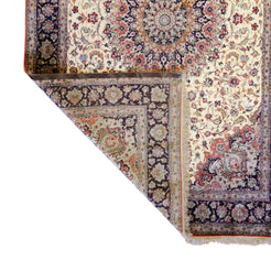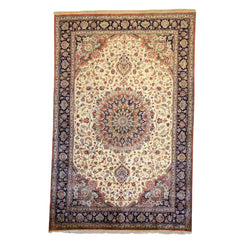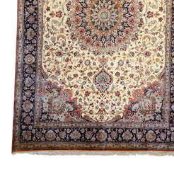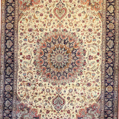 Woven from high-quality 100% SILK, this rug delivers lasting durability and a luxurious feel underfoot. The deep BEIGE base color is beautifully complemented by a NAVY border, creating a striking visual balance.