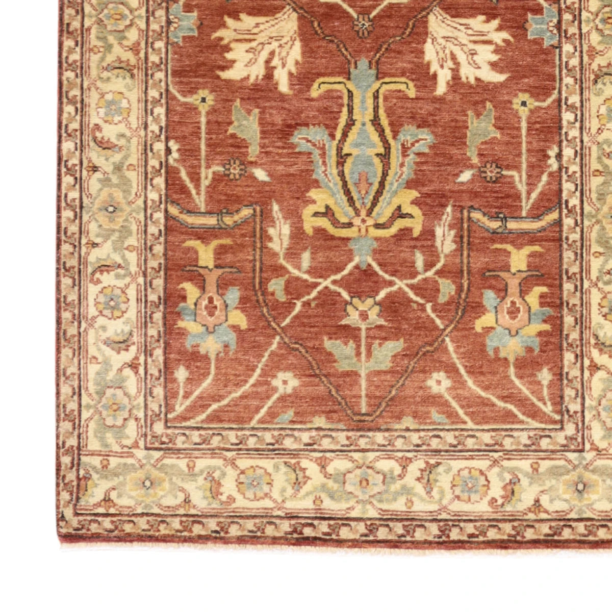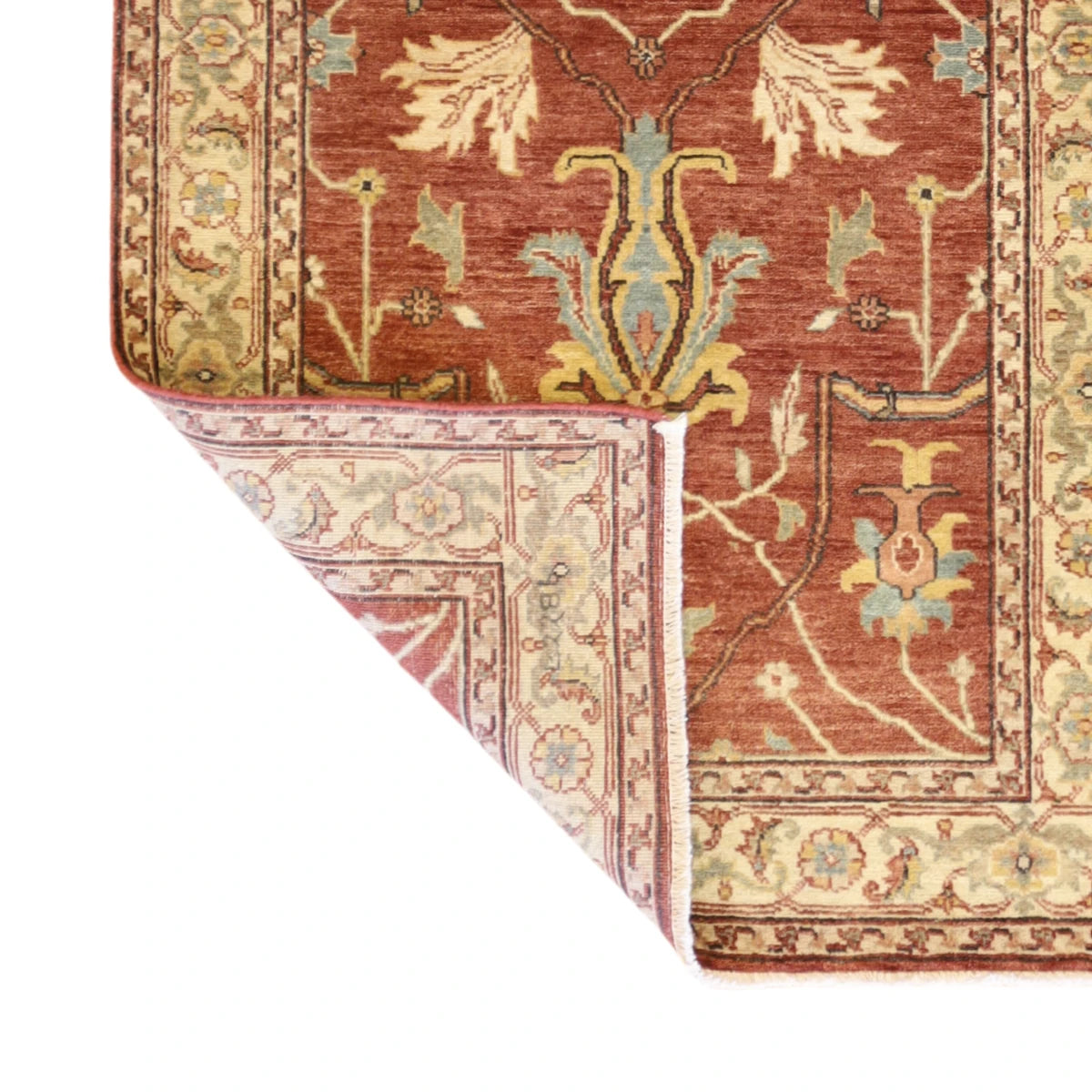 Made from premium WOOL, it offers a blend of lasting durability and a soft, comfortable feel. The deep ORANGE base is elegantly framed with a BEIGE border, creating a balanced and stylish look.