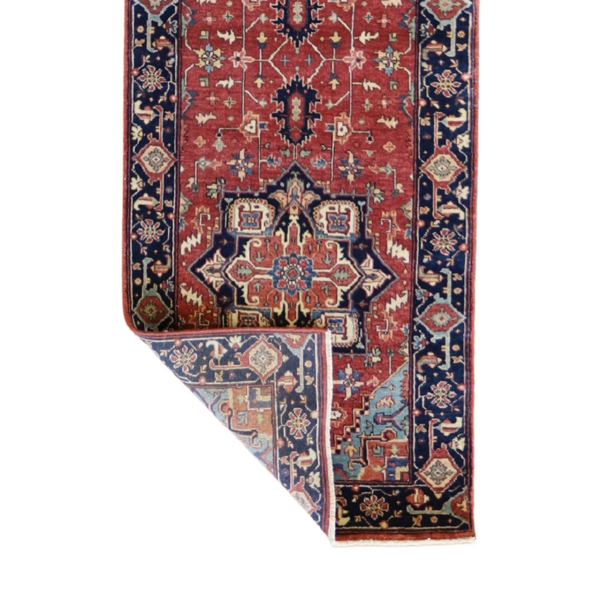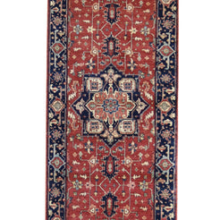 Made from high-quality WOOL, this runner is both durable and soft underfoot. The elegant RED base color paired with a refined NAVY border adds warmth and movement to your interior.