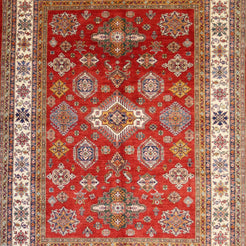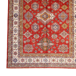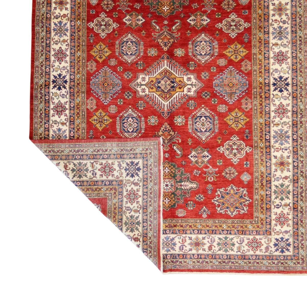 Add a Bold Touch with GEOMETRIC Style. This stunning KAZAK rug, crafted in a striking geometric design, brings a modern and bold look to your home. The clean, sharp lines and symmetrical patterns on the RED base create a dynamic visual effect, making this rug a perfect statement piece. A contrasting IVORY border adds a touch of sophistication, enhancing the overall design. Whether placed in your living room, office, or any open space, the geometric pattern brings structure and energy to your decor. Sourced from PAKISTAN, this handmade rug is a lasting investment in craftsmanship and style. Measuring 8' 0" x 10' 4", it elevates your space while standing the test of time.