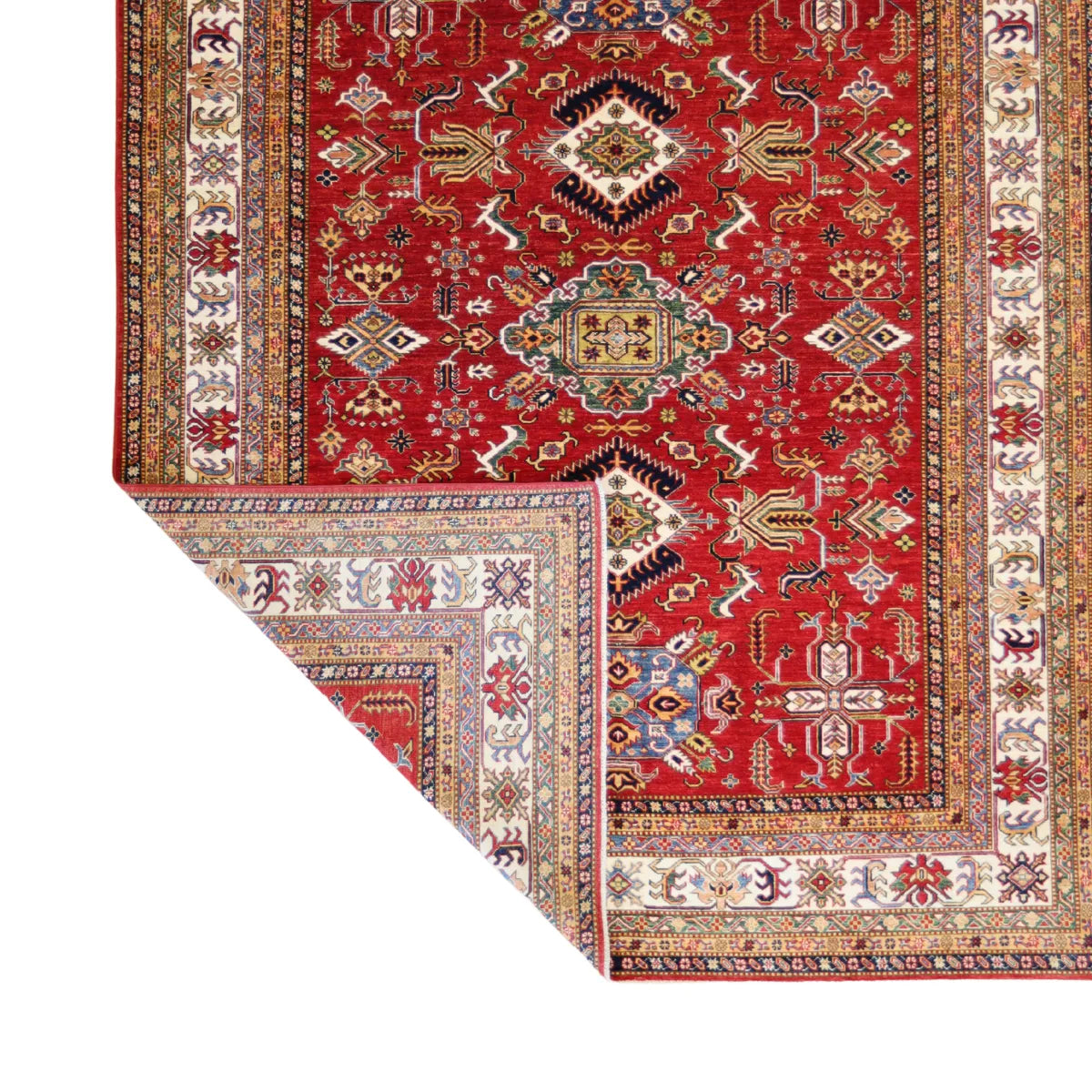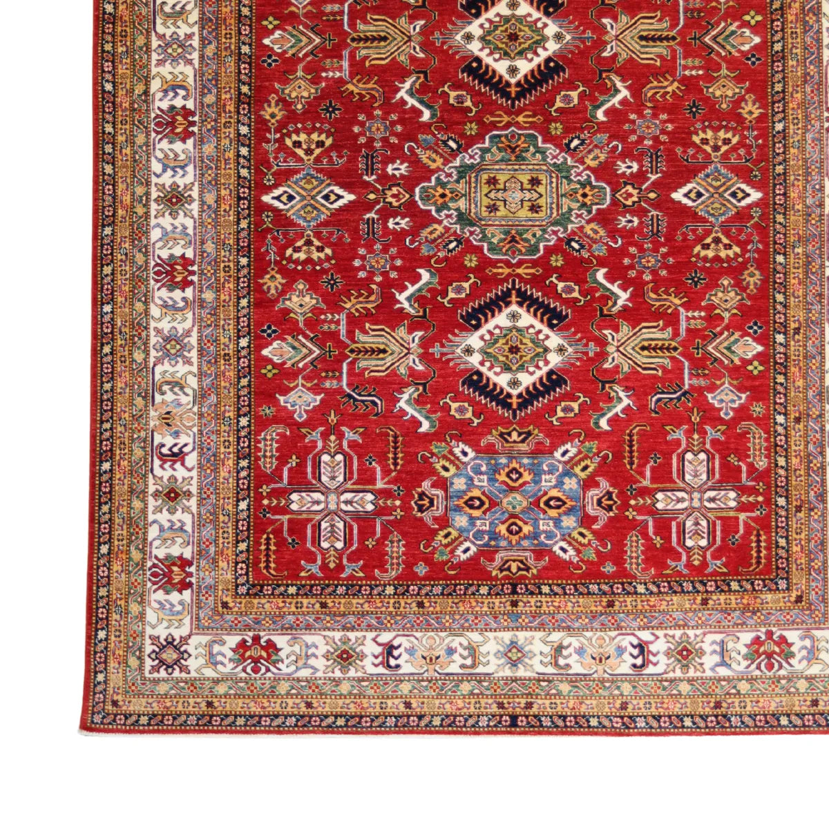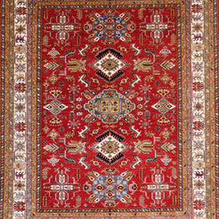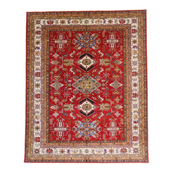 Add a Bold Touch with GEOMETRIC Style. This stunning KAZAK rug, crafted in a striking geometric design, brings a modern and bold look to your home. The clean, sharp lines and symmetrical patterns on the RED base create a dynamic visual effect, making this rug a perfect statement piece. A contrasting BEIGE border adds a touch of sophistication, enhancing the overall design. Whether placed in your living room, office, or any open space, the geometric pattern brings structure and energy to your decor. Sourced from PAKISTAN, this handmade rug is a lasting investment in craftsmanship and style. Measuring 8' 1" x 10' 1", it elevates your space while standing the test of time.