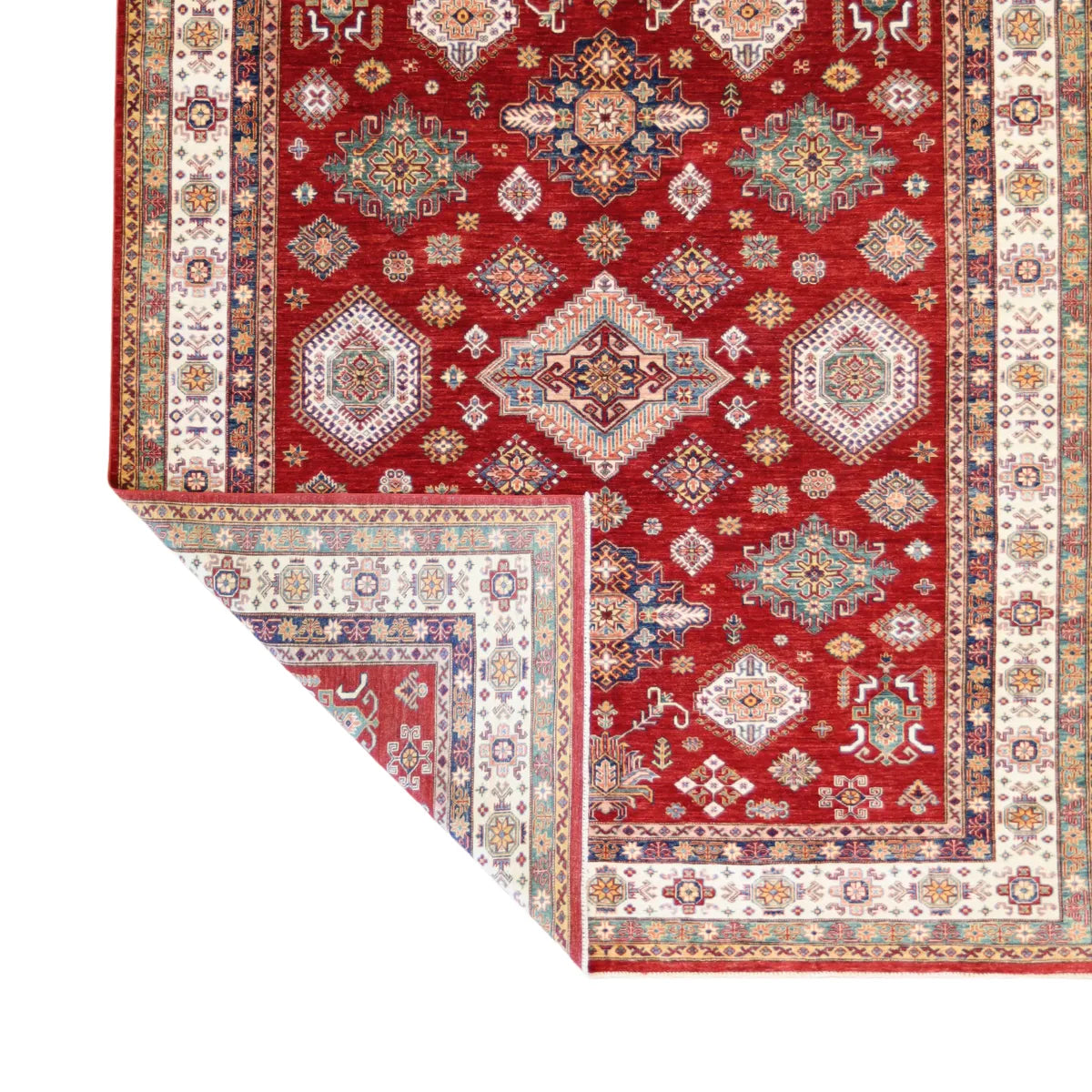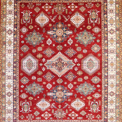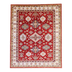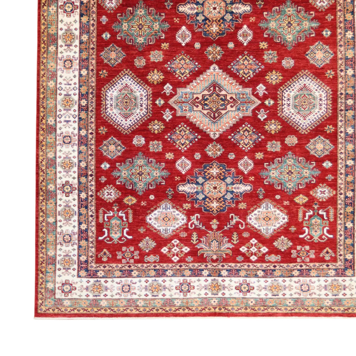 Add a Bold Touch with GEOMETRIC Style. This stunning KAZAK rug, crafted in a striking geometric design, brings a modern and bold look to your home. The clean, sharp lines and symmetrical patterns on the RED base create a dynamic visual effect, making this rug a perfect statement piece. A contrasting IVORY border adds a touch of sophistication, enhancing the overall design. Whether placed in your living room, office, or any open space, the geometric pattern brings structure and energy to your decor. Sourced from PAKISTAN, this handmade rug is a lasting investment in craftsmanship and style. Measuring 8' 1" x 9' 11", it elevates your space while standing the test of time.