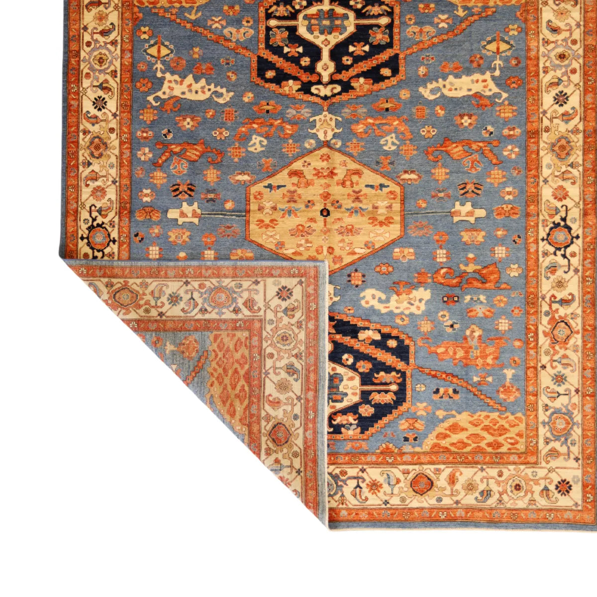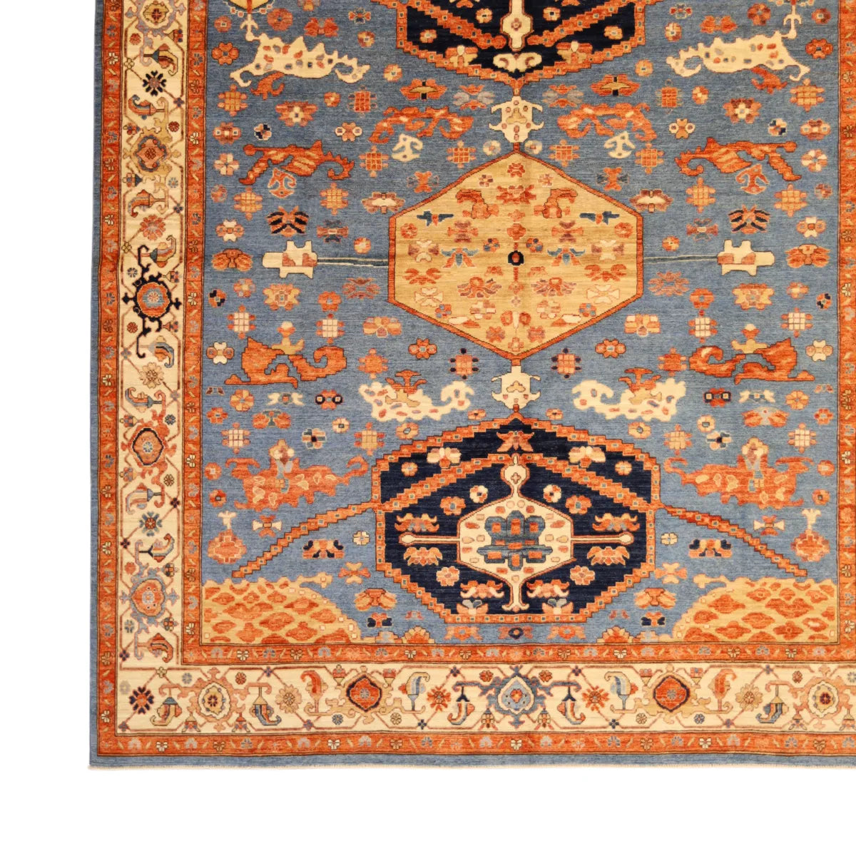 Add a Bold Touch with GEOMETRIC Style. This stunning KAZAK rug, crafted in a striking geometric design, brings a modern and bold look to your home. The clean, sharp lines and symmetrical patterns on the BLUE base create a dynamic visual effect, making this rug a perfect statement piece. A contrasting IVORY border adds a touch of sophistication, enhancing the overall design. Whether placed in your living room, office, or any open space, the geometric pattern brings structure and energy to your decor. Sourced from PAKISTAN, this handmade rug is a lasting investment in craftsmanship and style. Measuring 8' 3" x 9' 8", it elevates your space while standing the test of time.
