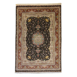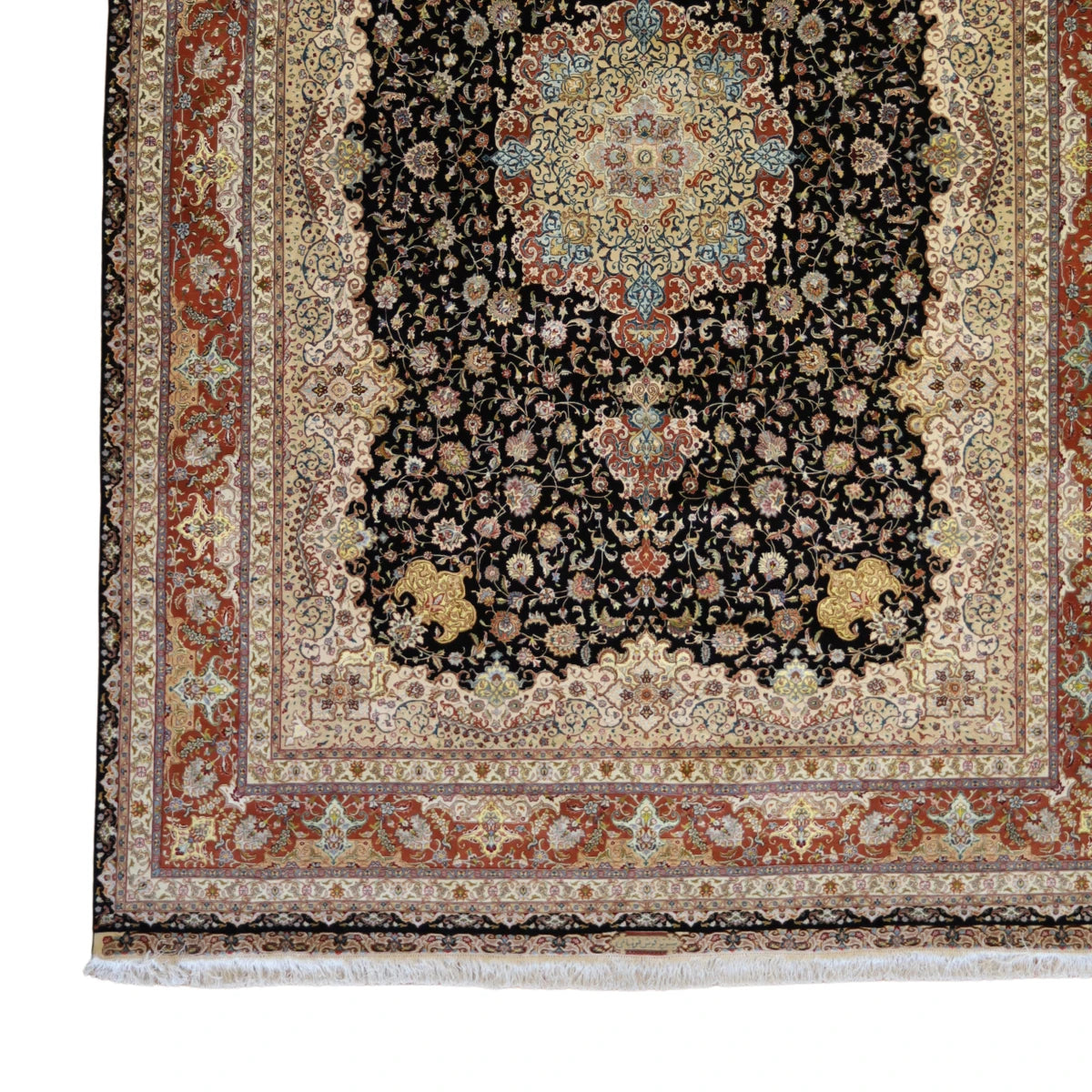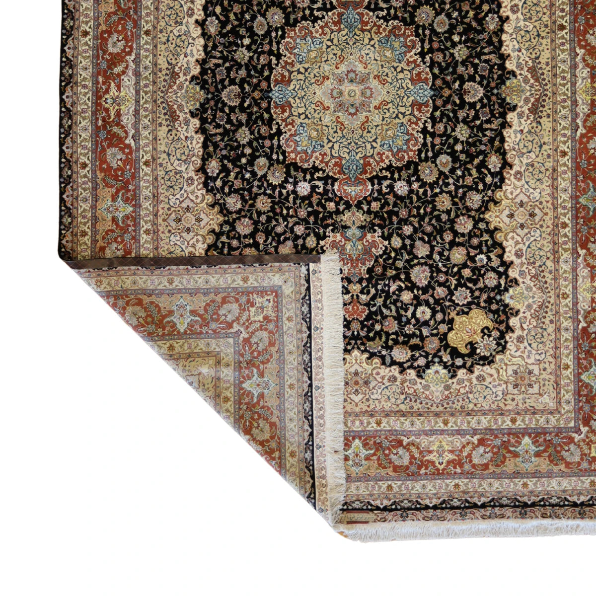 Woven from high-quality SILK&WOOL, this rug delivers lasting durability and a luxurious feel underfoot. The deep BLACK base color is beautifully complemented by a RUST border, creating a striking visual balance.