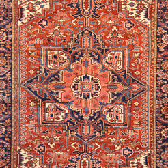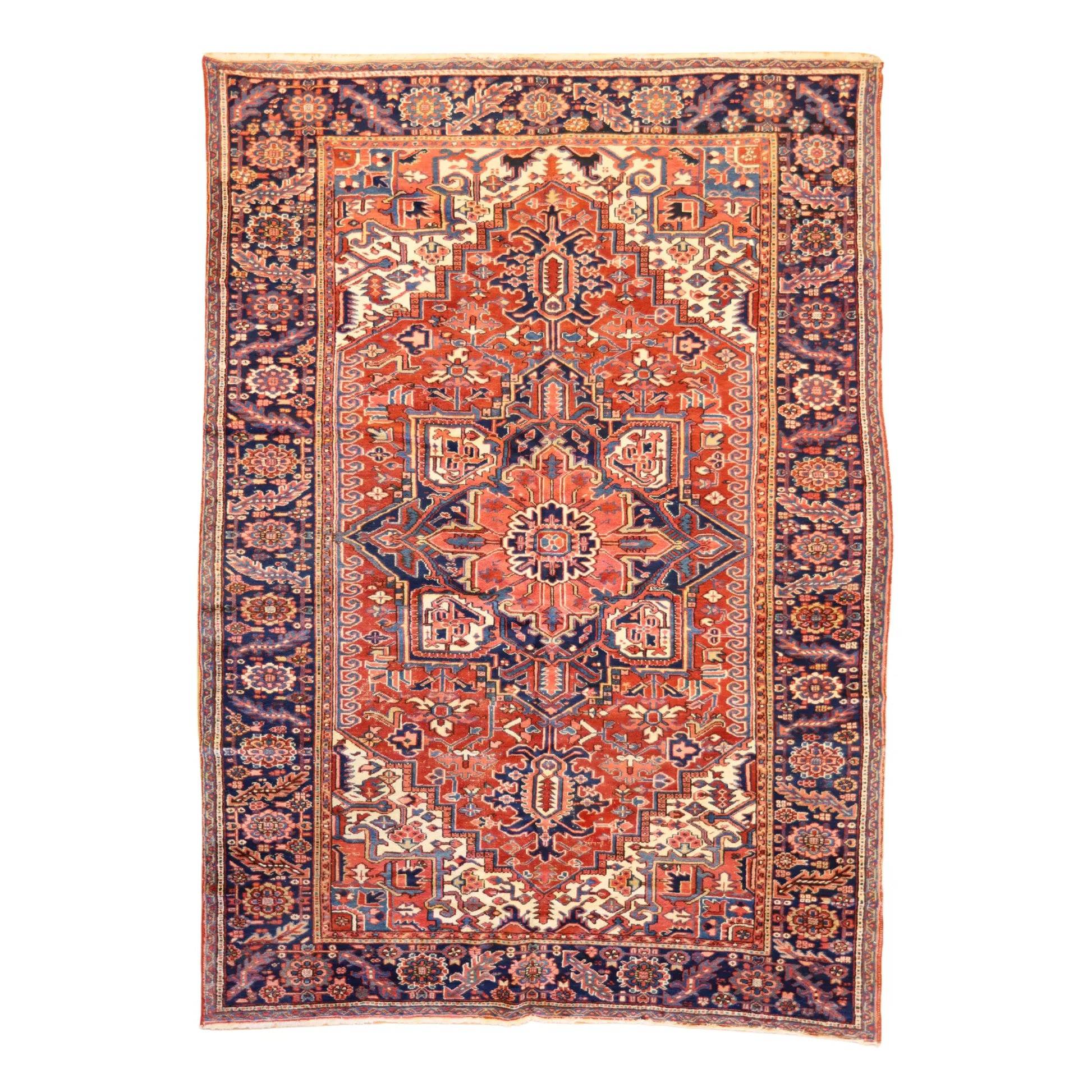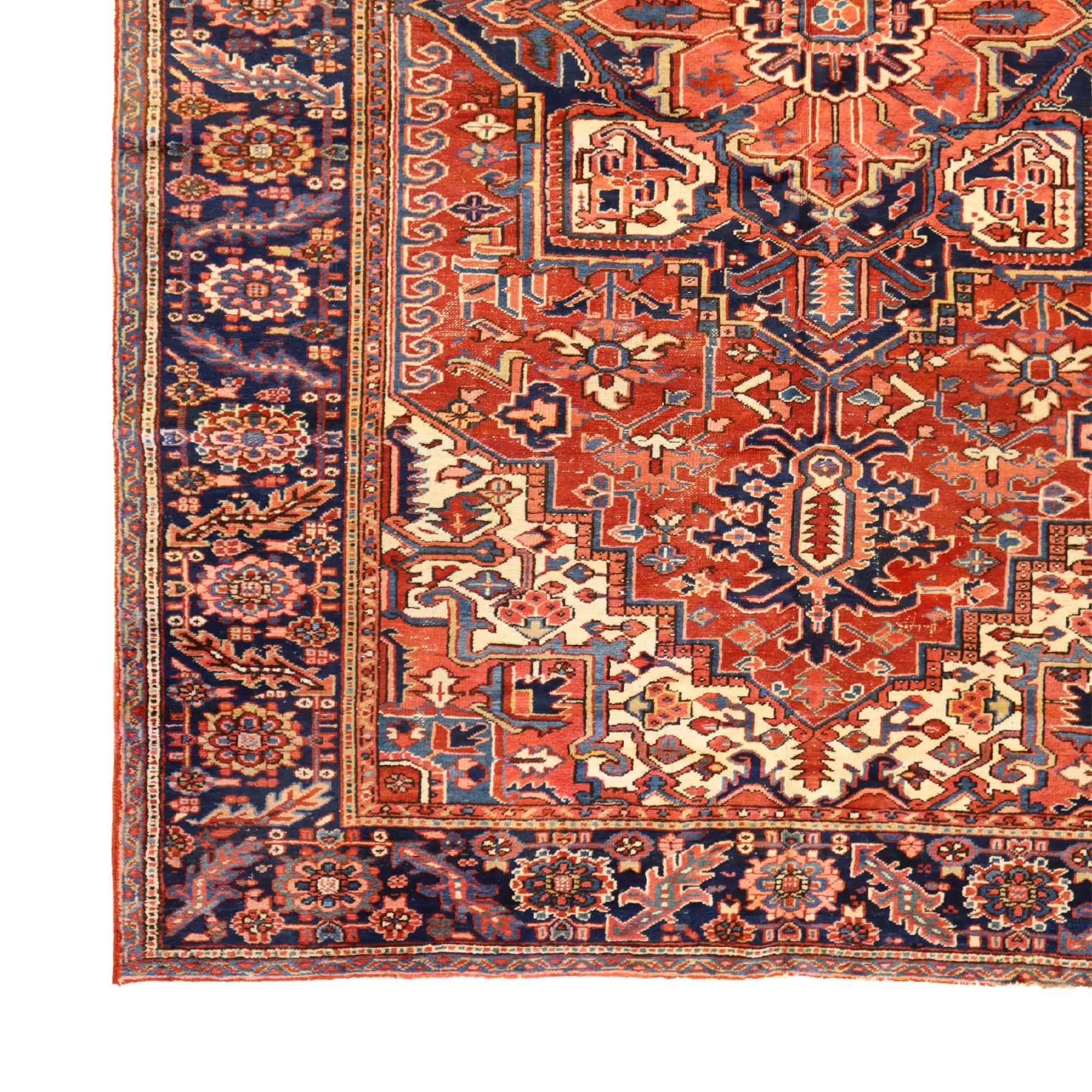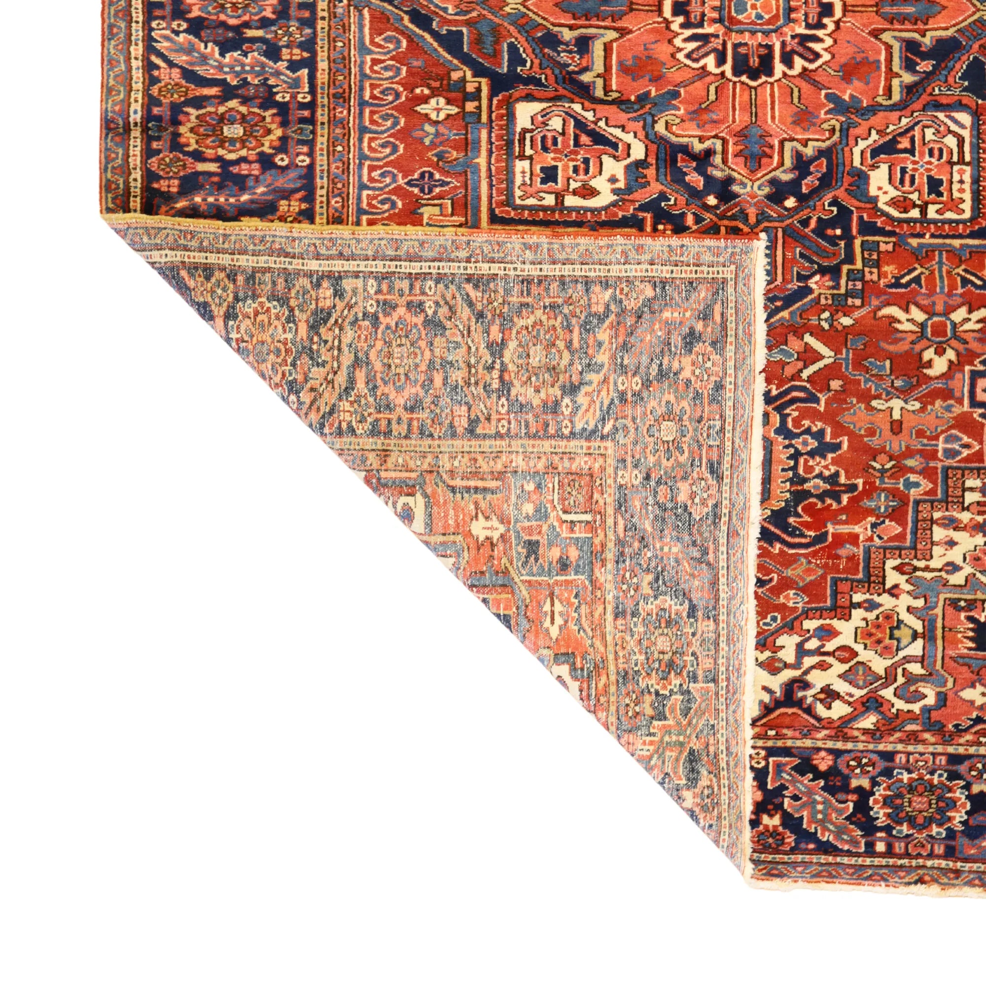 Add Timeless Elegance to Your Space with an Antique Rug. This exquisite HERIZ antique rug, showcasing a rich heritage and intricate artistry, is a testament to timeless beauty. The striking RED background, paired with its intricate NAVY border, creates a captivating contrast that adds sophistication to any room. Perfect for your living room, dining area, or study, this rug blends style with history to enrich your decor. Handcrafted in PERSIA, this rug reflects the skilled craftsmanship and cultural legacy of its origin. With dimensions of 8'6" x 12'0" , its high-quality construction ensures lasting beauty for generations to come.
