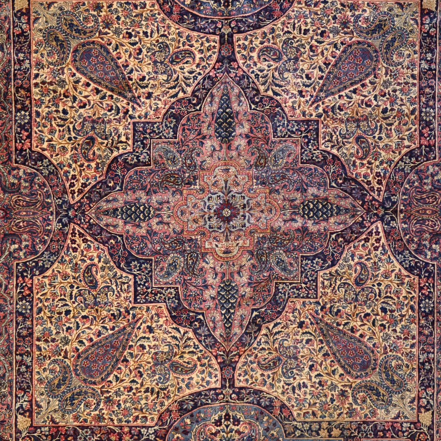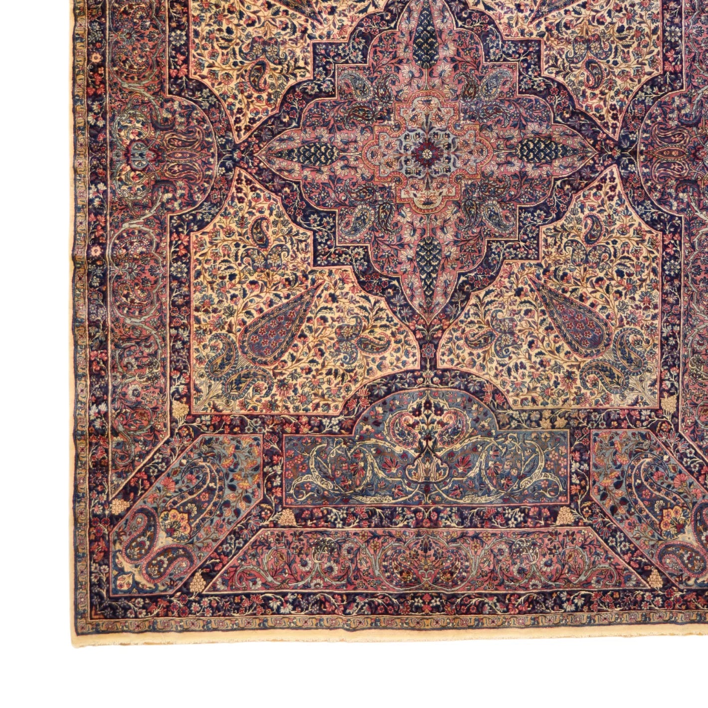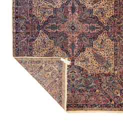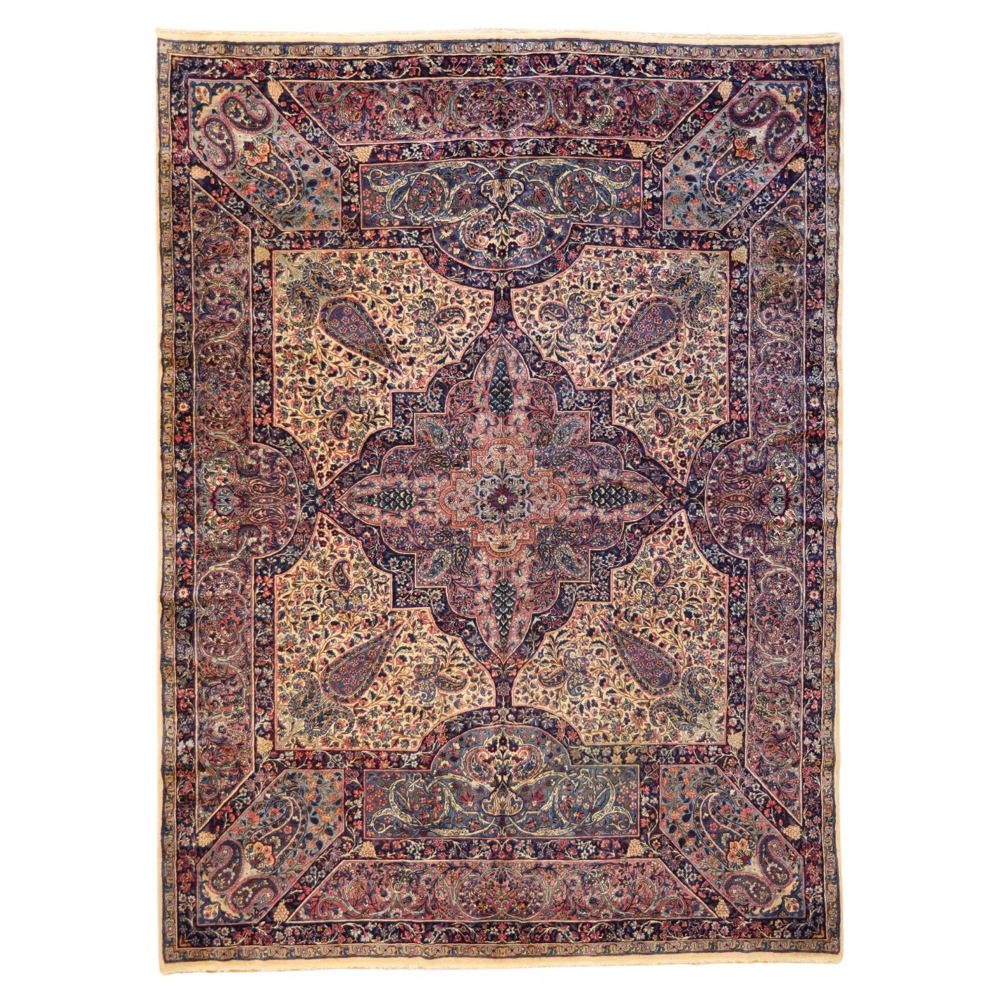 Add Timeless Elegance to Your Space with an Antique Rug. This exquisite KERMAN antique rug, showcasing a rich heritage and intricate artistry, is a testament to timeless beauty. The striking WHITE background, paired with its intricate MAUVE border, creates a captivating contrast that adds sophistication to any room. Perfect for your living room, dining area, or study, this rug blends style with history to enrich your decor. Handcrafted in PERSIA, this rug reflects the skilled craftsmanship and cultural legacy of its origin. With dimensions of 8'8" x 11'10" , its high-quality construction ensures lasting beauty for generations to come.