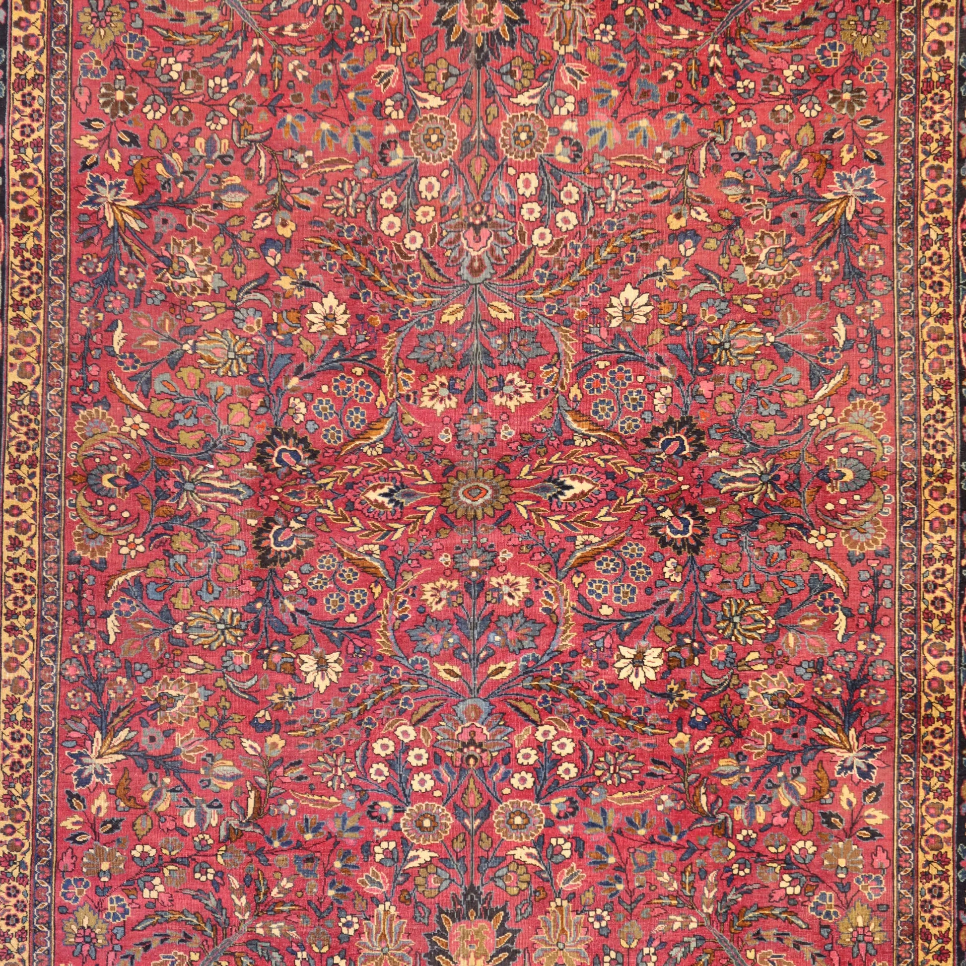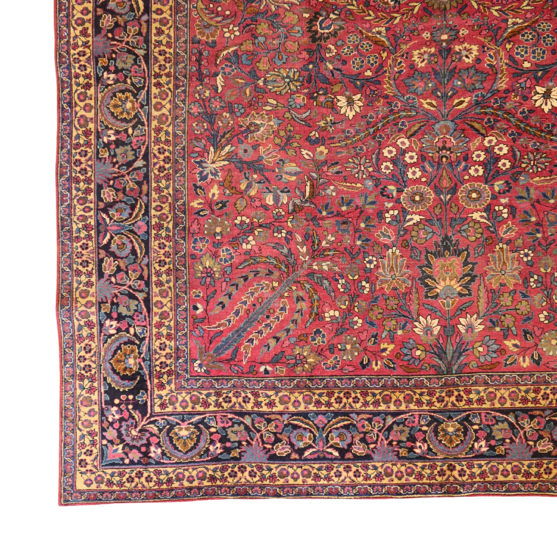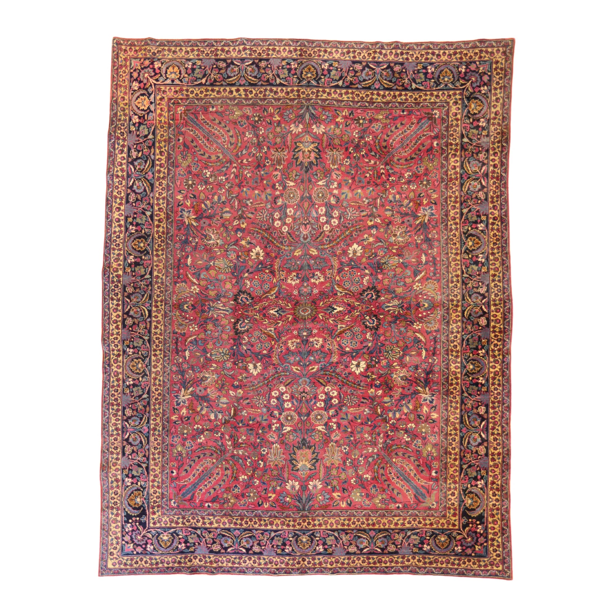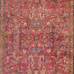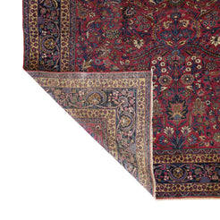 Add Timeless Elegance to Your Space with an Antique Rug. This exquisite MASHAD antique rug, showcasing a rich heritage and intricate artistry, is a testament to timeless beauty. The striking MAGENTA background, paired with its intricate NAVY border, creates a captivating contrast that adds sophistication to any room. Perfect for your living room, dining area, or study, this rug blends style with history to enrich your decor. Handcrafted in PERSIA, this rug reflects the skilled craftsmanship and cultural legacy of its origin. With dimensions of 8'8" x 11'3" , its high-quality construction ensures lasting beauty for generations to come.