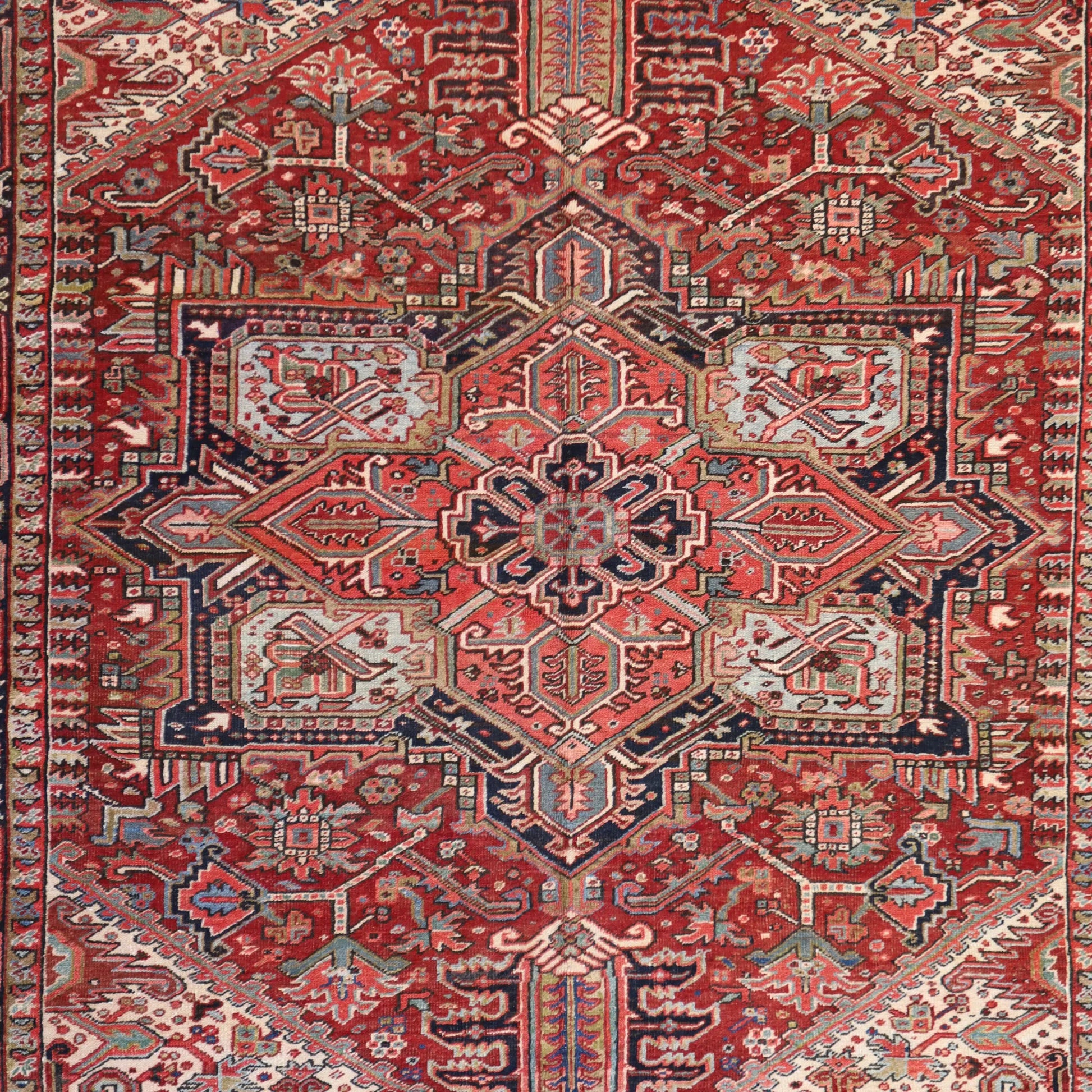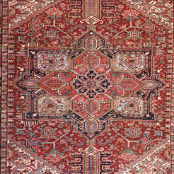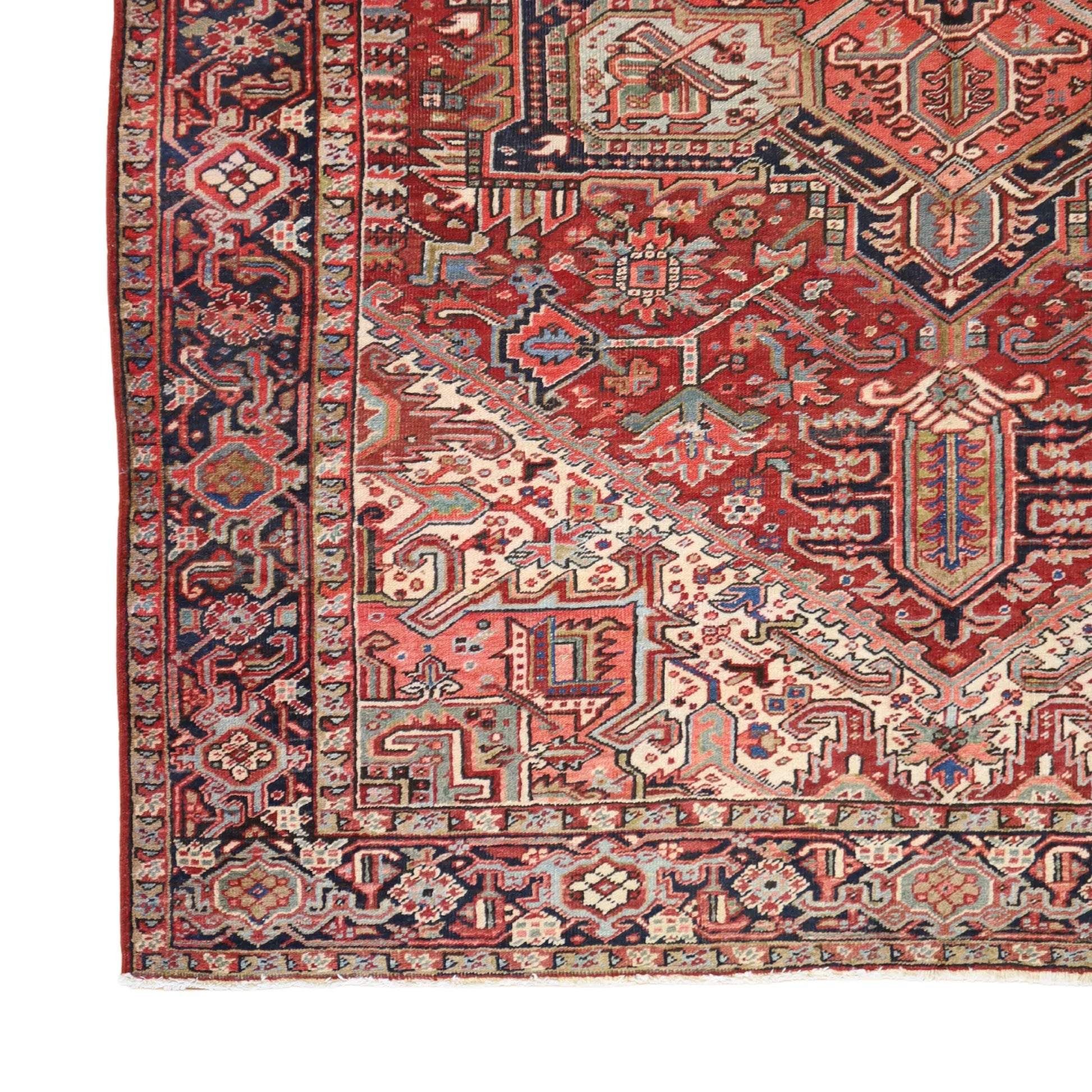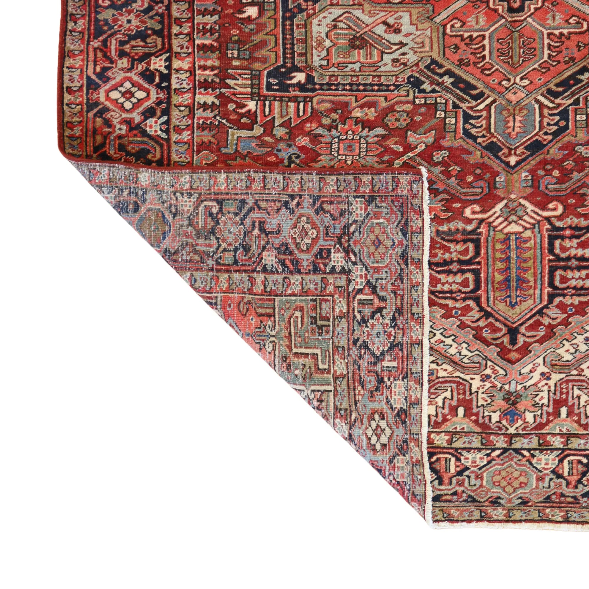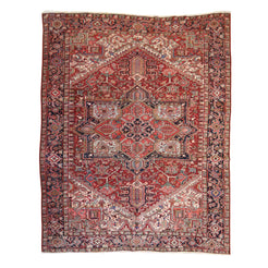 Add Timeless Elegance to Your Space with an Antique Rug. This exquisite HERIZ antique rug, showcasing a rich heritage and intricate artistry, is a testament to timeless beauty. The striking RED background, paired with its intricate NAVY border, creates a captivating contrast that adds sophistication to any room. Perfect for your living room, dining area, or study, this rug blends style with history to enrich your decor. Handcrafted in PERSIA, this rug reflects the skilled craftsmanship and cultural legacy of its origin. With dimensions of 8'9" x 11'0" , its high-quality construction ensures lasting beauty for generations to come.