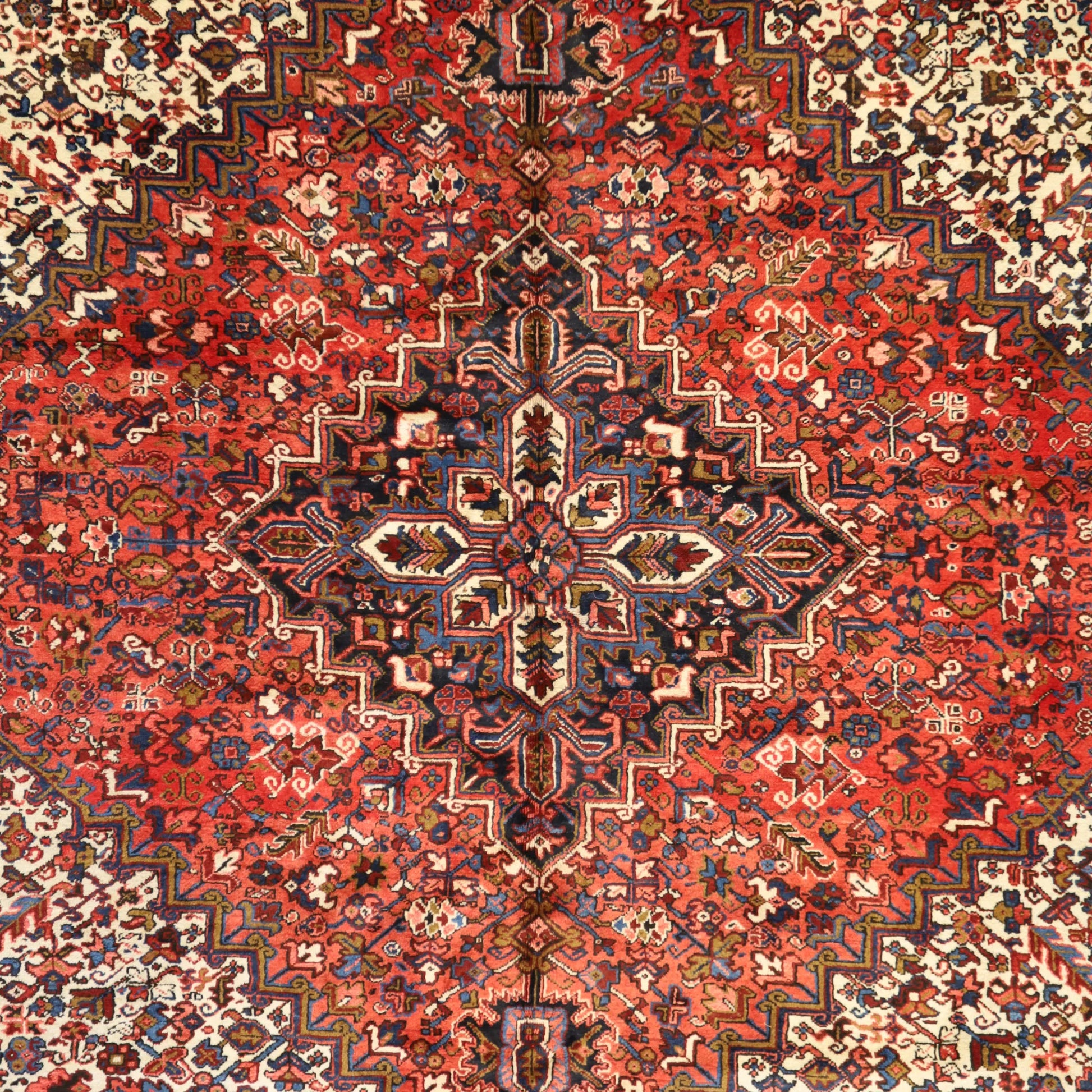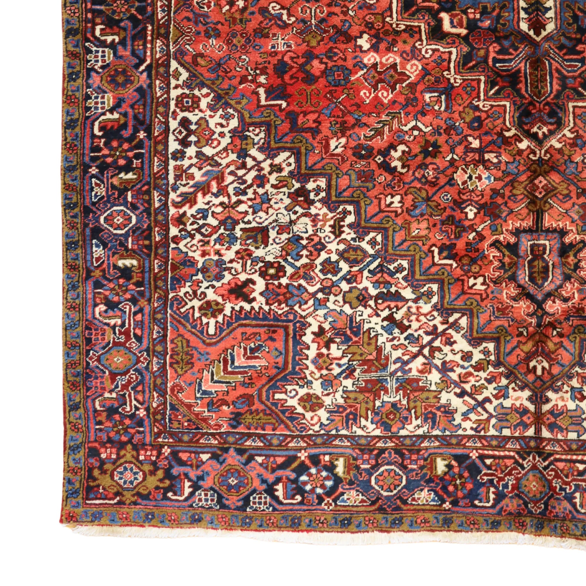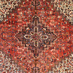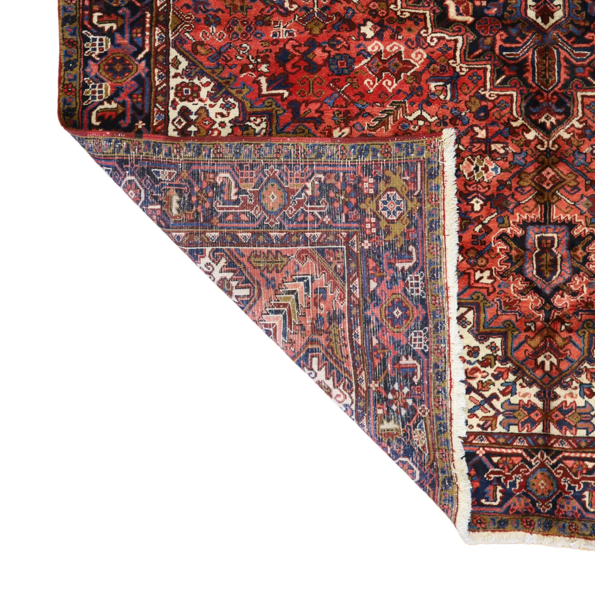 Add Timeless Elegance to Your Space with an Antique Rug. This exquisite HERIZ antique rug, showcasing a rich heritage and intricate artistry, is a testament to timeless beauty. The striking RED background, paired with its intricate NAVY border, creates a captivating contrast that adds sophistication to any room. Perfect for your living room, dining area, or study, this rug blends style with history to enrich your decor. Handcrafted in PERSIA, this rug reflects the skilled craftsmanship and cultural legacy of its origin. With dimensions of 9'0" x 11'6" , its high-quality construction ensures lasting beauty for generations to come.