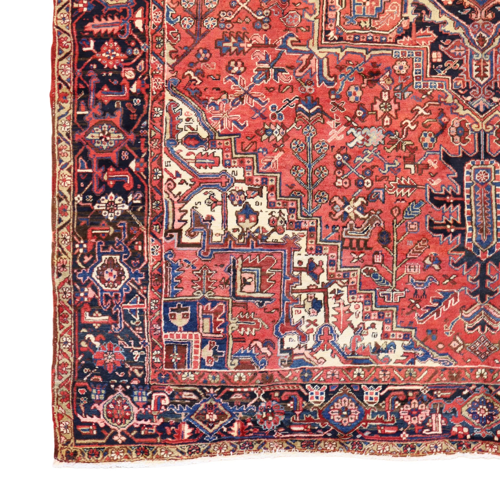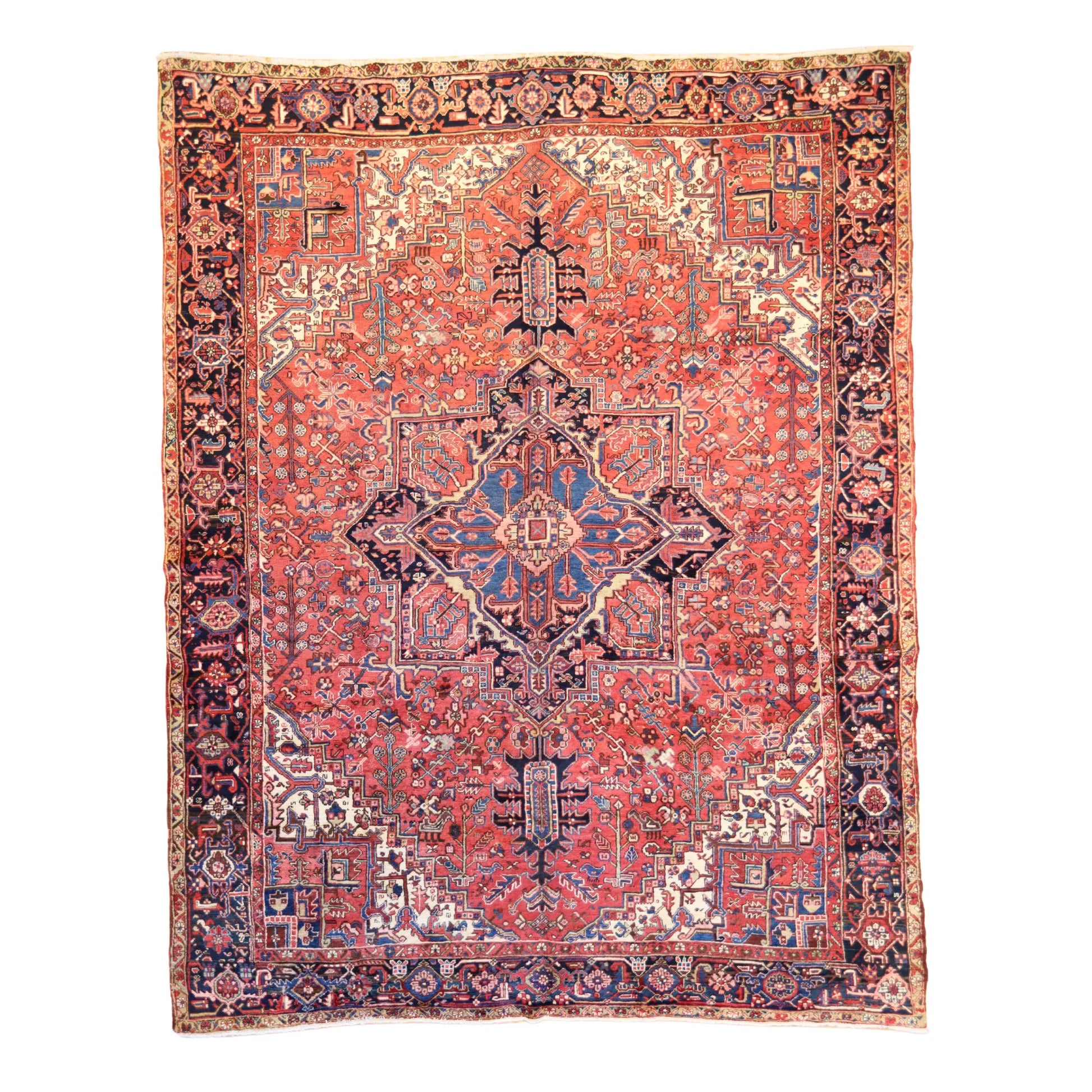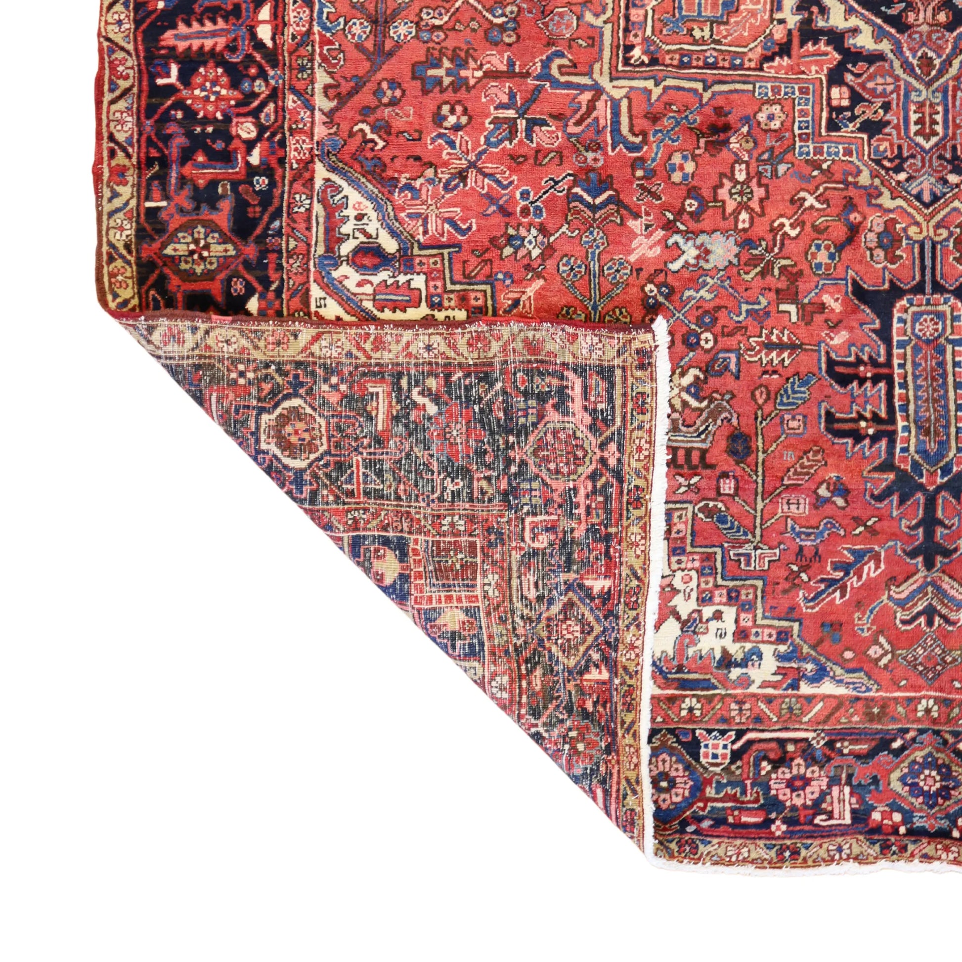 Add Timeless Elegance to Your Space with an Antique Rug. This exquisite HERIZ antique rug, showcasing a rich heritage and intricate artistry, is a testament to timeless beauty. The striking RED background, paired with its intricate BLUE border, creates a captivating contrast that adds sophistication to any room. Perfect for your living room, dining area, or study, this rug blends style with history to enrich your decor. Handcrafted in PERSIA, this rug reflects the skilled craftsmanship and cultural legacy of its origin. With dimensions of 9'10" x 12'8" , its high-quality construction ensures lasting beauty for generations to come.