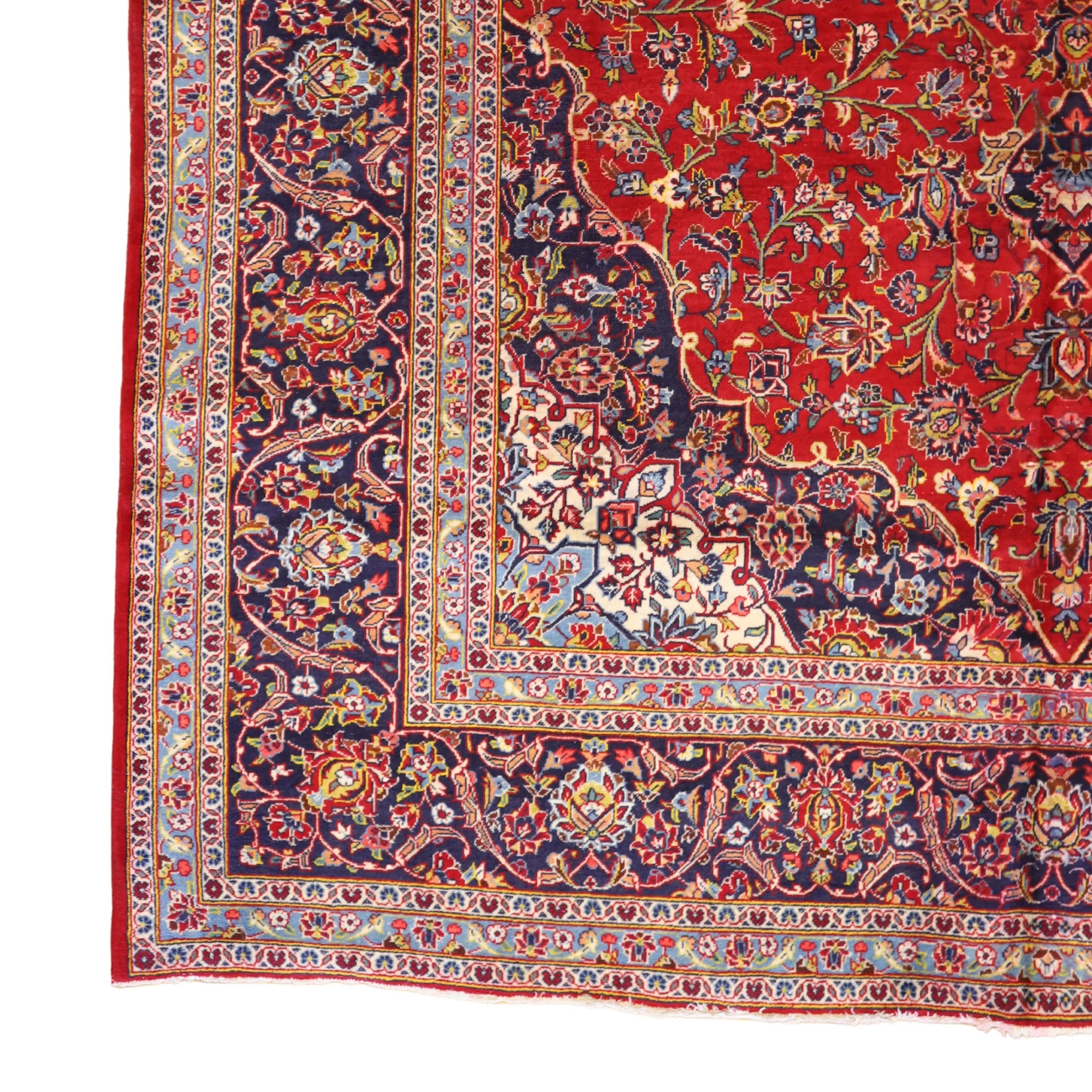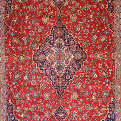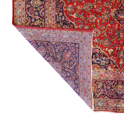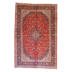 Add Timeless Elegance to Your Space with an Antique Rug. This exquisite KASHAN antique rug, showcasing a rich heritage and intricate artistry, is a testament to timeless beauty. The striking RED background, paired with its intricate NAVY border, creates a captivating contrast that adds sophistication to any room. Perfect for your living room, dining area, or study, this rug blends style with history to enrich your decor. Handcrafted in PERSIA, this rug reflects the skilled craftsmanship and cultural legacy of its origin. With dimensions of 9'8" x 14'7" , its high-quality construction ensures lasting beauty for generations to come.